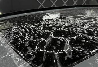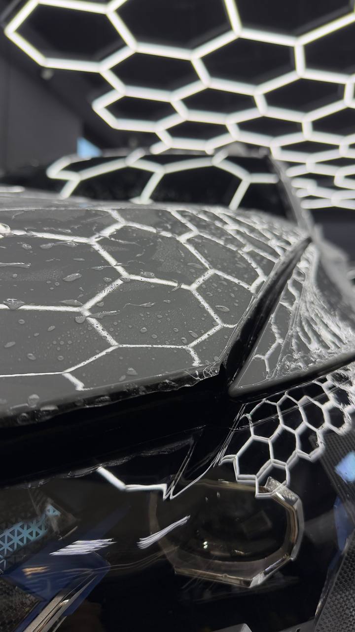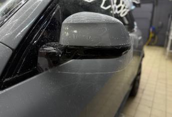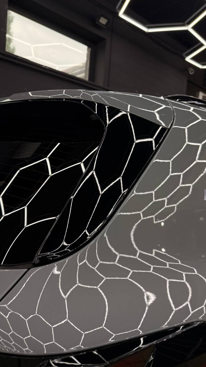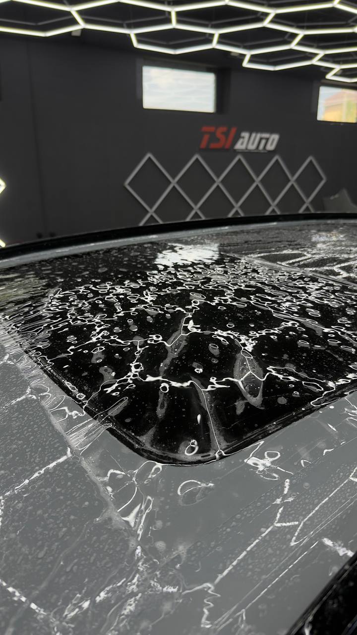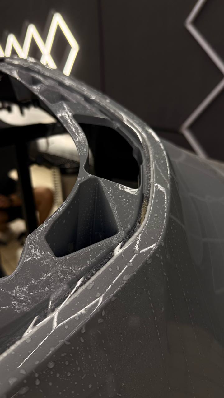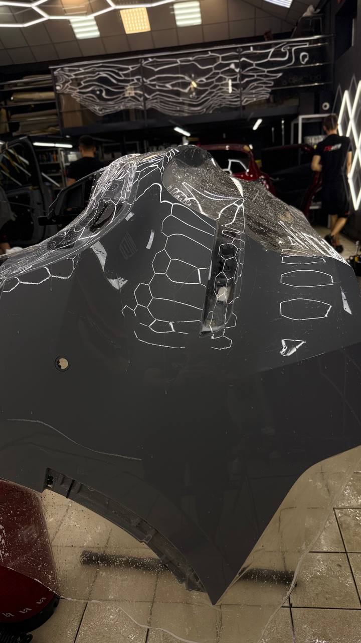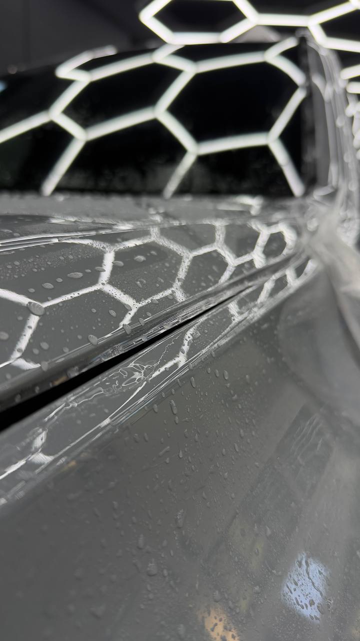 Далее не о процессе, а о конечном результате который получается на данном авто. Автомобиль будет меньше пачкаться, пленка обладает высоким гидрофобным эффектом и грязь не будет задерживаться на кузове. Ну и самое главное это защита, каждый оклеенный элемент выполнен с подворотом пленки по периметру. Сколы и царапины больше не угрожают оклеенным кузовным элементам данного автомобиля, и если вдруг произойдет неприятная ситуация с мелким ДТП к примеру во дворе, с большей долей вероятности этот вопрос решиться заменой пленки на отдельном элементе. Так же автомобиль обрел на долго гарантированный блеск, так как пленка имеет самозаживляющий эффект и мелкие риски и царапинки будут затягиваться под воздействием температуры.
