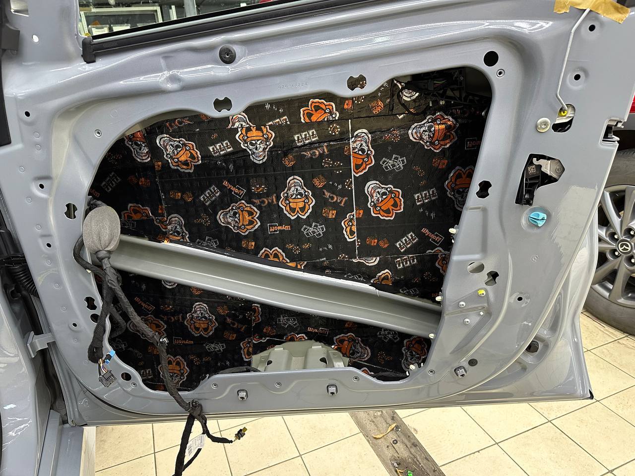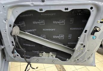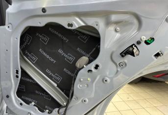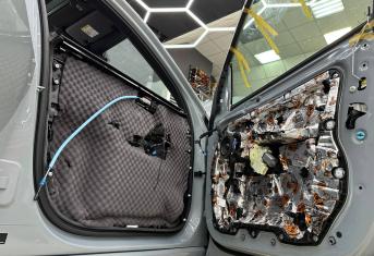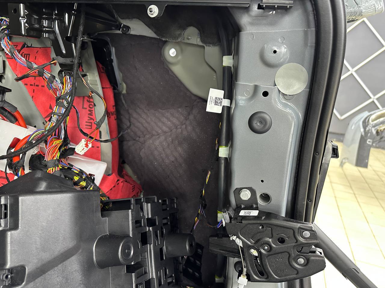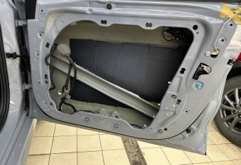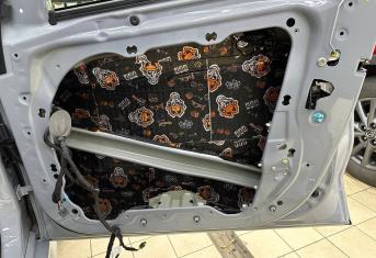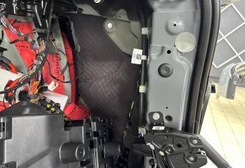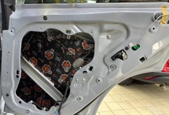 Третьим слоем применяем виброизоляцию Шумофф Jack на внутреннюю стенку двери. Проводку частично обрабатываем Шумофф Specific. Саму обшивку двери оклеиваем виброизоляцией Шумофф М2 и полностью закрываем шумопоглощающим материалом Шумофф Герметон А15. Обратите внимание, как тщательно мы обрабатываем двери виброизоляцией и шумопоглотителем - мы не экономим материал и щедро укладываем его в необходимые места. По канту обшивки двери и клипсы укладываем Шумофф Absorber 5, чтобы избежать раздражительных звуков и не портить ЛКП.