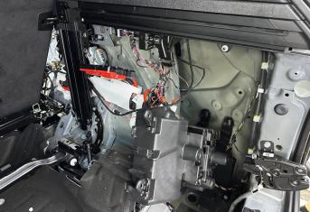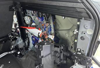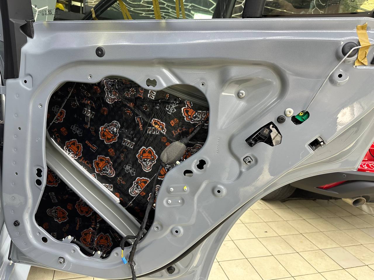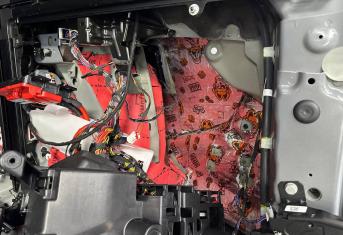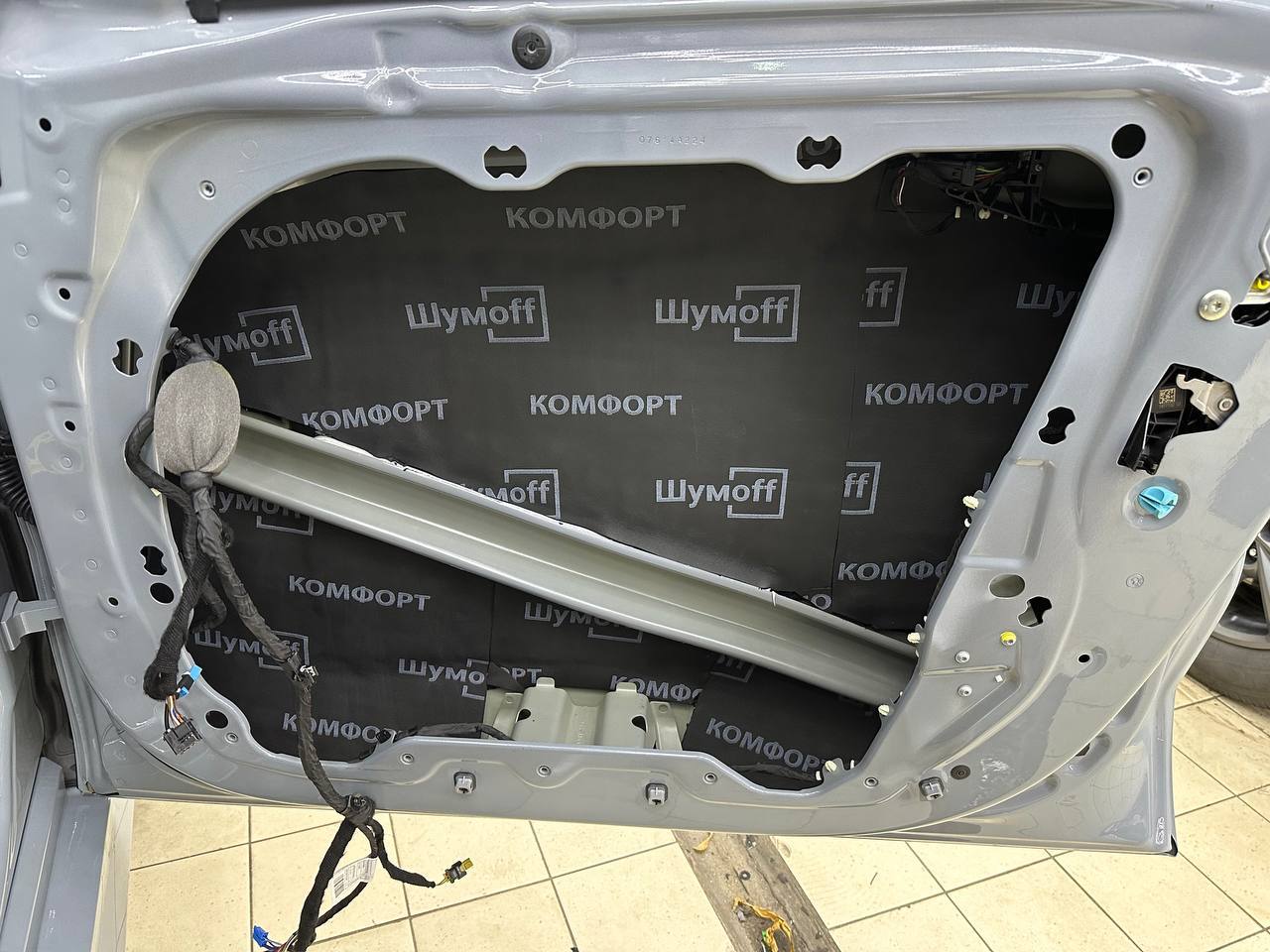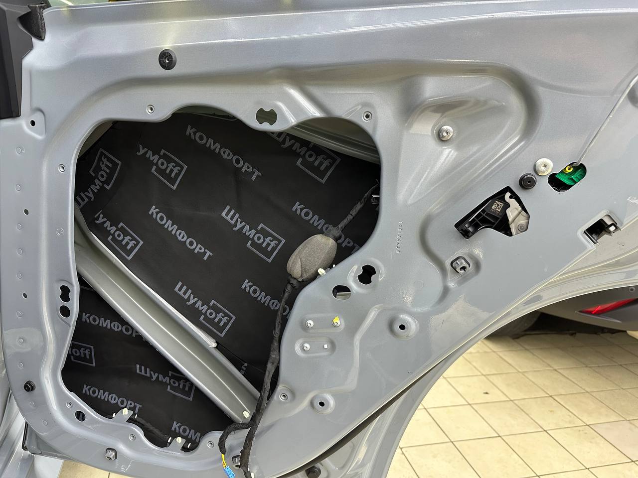 Третьим слоем применяем виброизоляцию Шумофф Jack на внутреннюю стенку двери. Проводку частично обрабатываем Шумофф Specific. Саму обшивку двери оклеиваем виброизоляцией Шумофф М2 и полностью закрываем шумопоглощающим материалом Шумофф Герметон А15. Обратите внимание, как тщательно мы обрабатываем двери виброизоляцией и шумопоглотителем - мы не экономим материал и щедро укладываем его в необходимые места. По канту обшивки двери и клипсы укладываем Шумофф Absorber 5, чтобы избежать раздражительных звуков и не портить ЛКП.