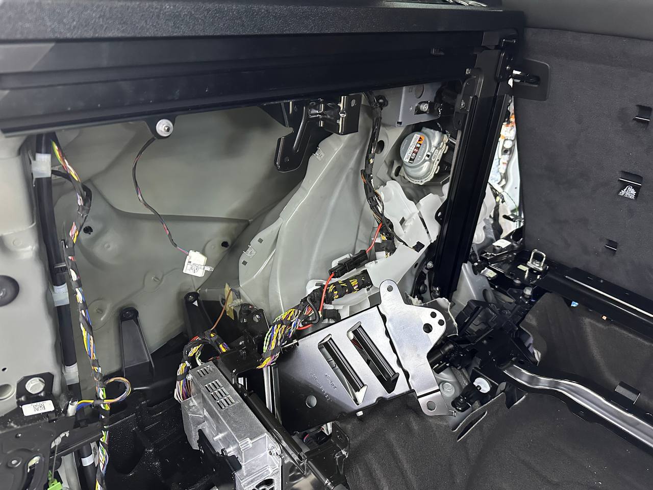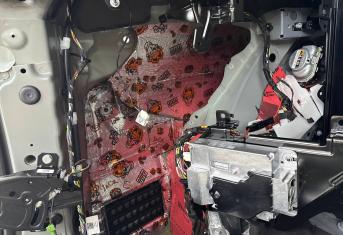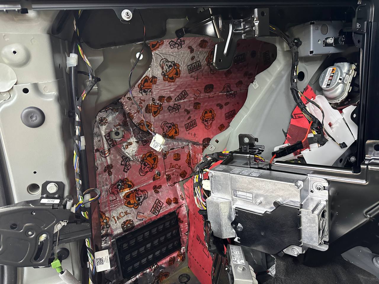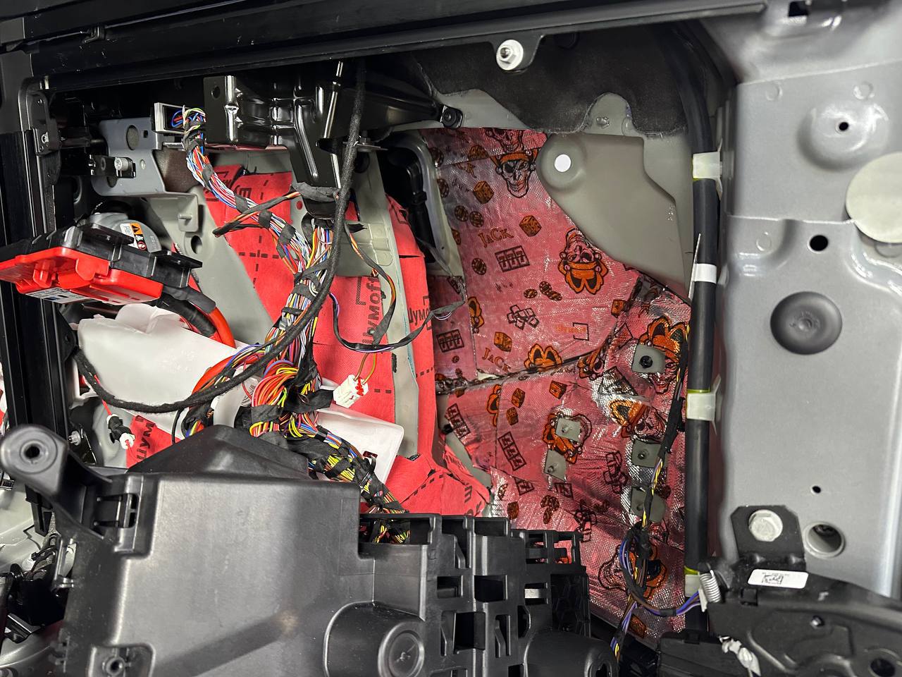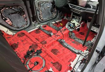 Штатная шумоизоляция в BMW X5 G05 присутствует в приличном количестве, но мы знаем как сделать лучше. Напыления вибродемпфера есть на полу салона, багажника и дверях. Остальные части кузова - голый металл. Ниже вы можете увидеть фотографии после полного разбора. Перед началом работ, мы в обязательном порядке проверяем заводскую шумоизоляцию на качество укладки. Плохо проклеенные участки демонтируем. После обезжириваем все поверхности и приступаем к монтажу.