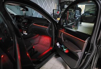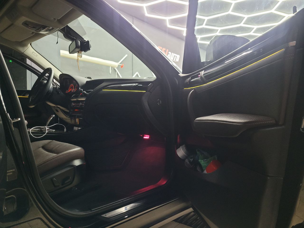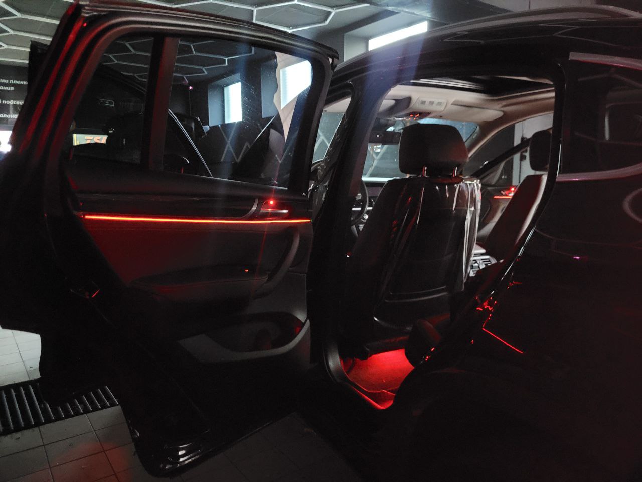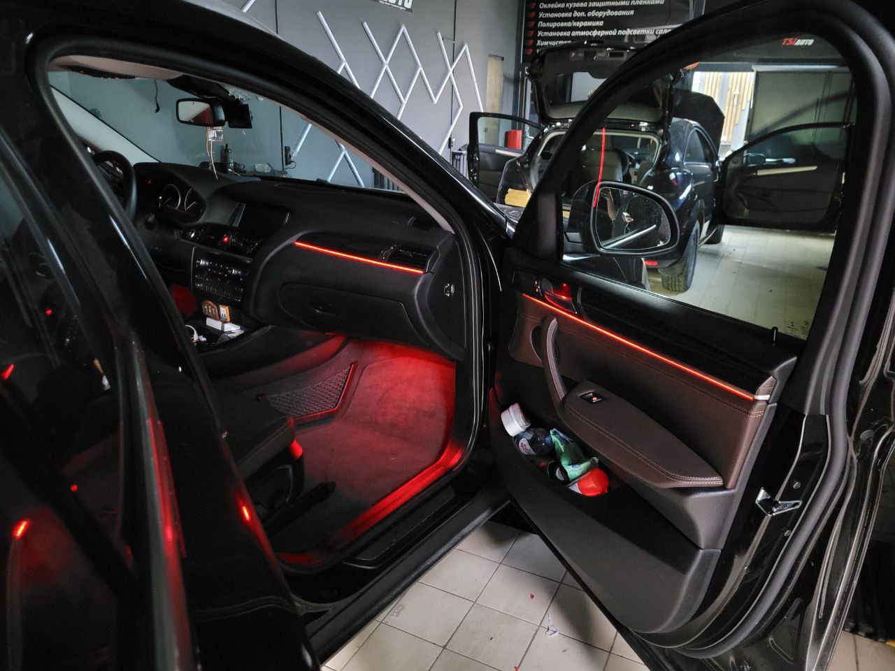 BMW X6 приехал на работы по установке дополнительного оборудования, а в частности установка атмосферной подсветки салона с управлением из приложения смартфона.