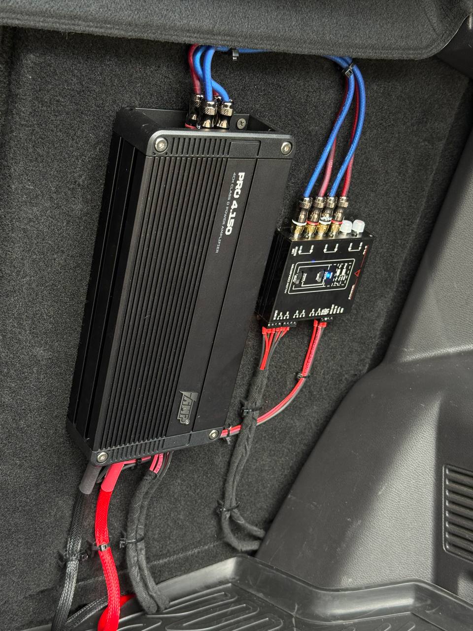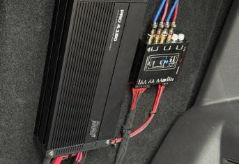 Усилитель и моноблок смонтировали на спинке заднего ряда сидений. Силовая проводка уложена по штатным местам, с обязательной установкой предохранителя под капотом. Тем самым мы сохранили функционал автомобиля и выиграли немного места в багажнике. Смотрите фото выполненных работ ниже.