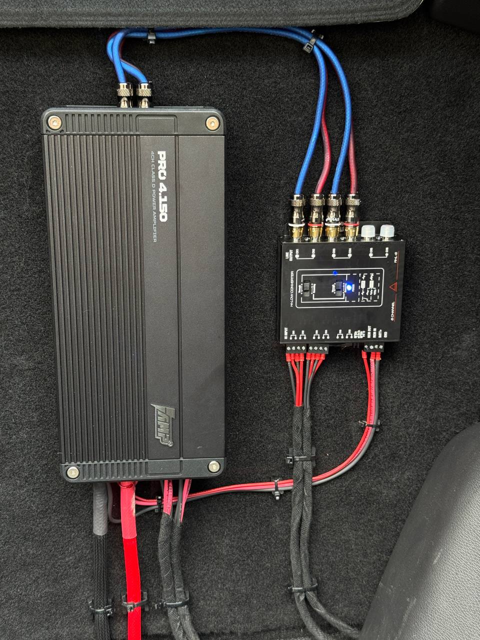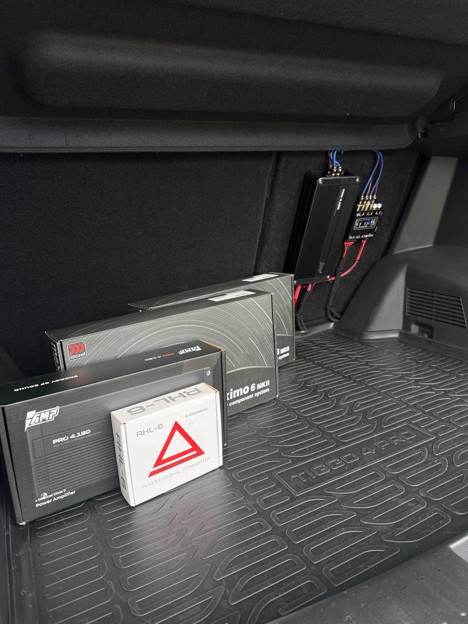 Всё установленное оборудование было куплено у нас. Мы выполняем услуги под ключ - продажа, установка и настройка оборудования для автозвука. На данном автомобиле мы установили усилитель от производителя AMP. Динамики Morel встали без проставок в штатные места. Обратите внимание на фото дверей, для глубины звука там была смонтирована наша авторская шумоизоляция в пять слоёв. Подробнее о шумоизоляции вы можете узнать из другого нашего отчета по Тигго 4. Данную связку мы используем не первый раз в этом авто и все владельцы были очень довольны!