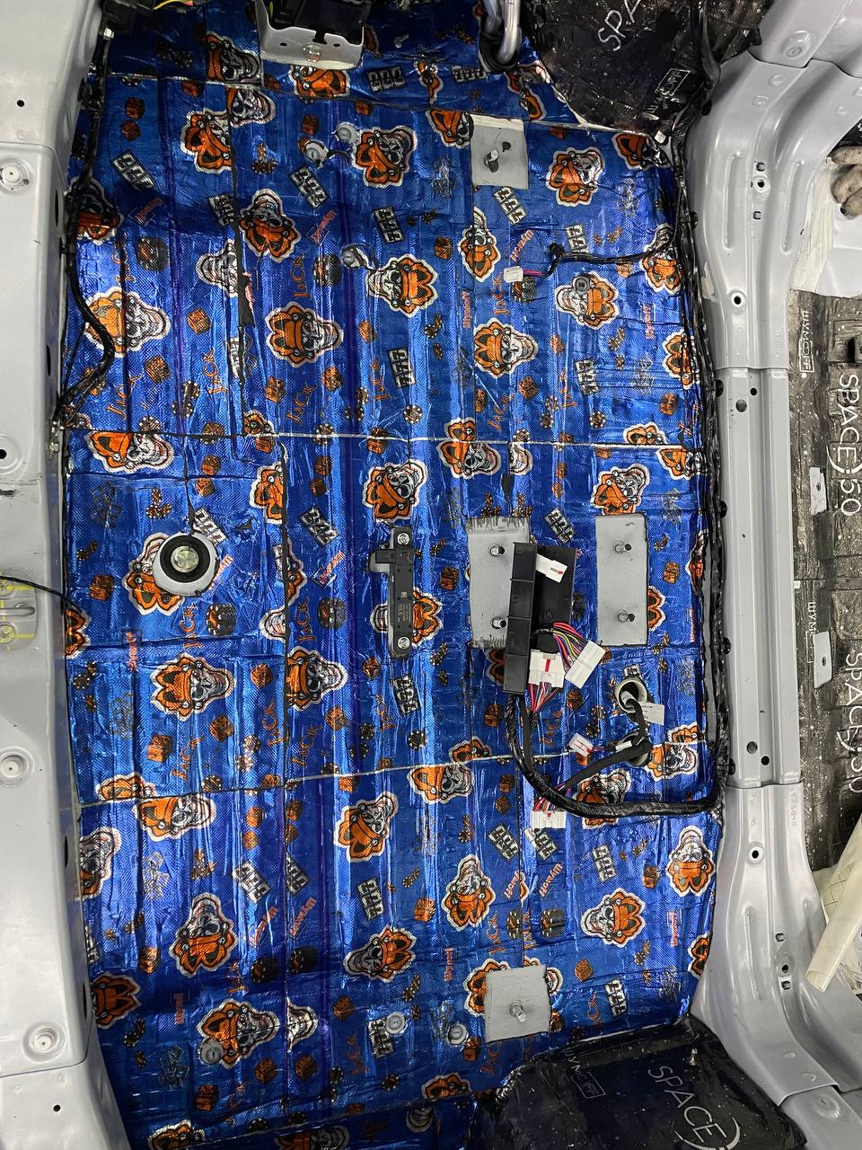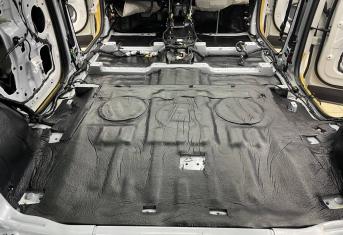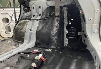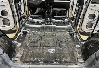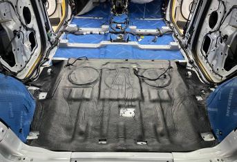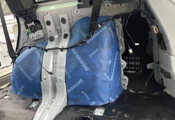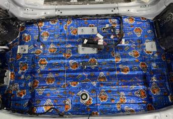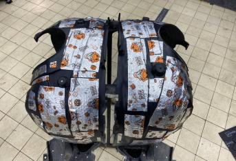 На первый слой по всему полу, от моторного щита до багажника используем Шумофф Space 5.0 – это премиальный многослойный вибродемпфер, включающий в себя прослойки мастики и битума. Эти составляющие позволяют ему эффективно работать в широком температурном диапазоне. Перед началом работ листы необходимо прогревать до 50 градусов, а затем приступать к монтажу и прикатке валиком. Пол в багажнике обрабатываем виброизоляцией Шумофф Super Jack - новый технологичный вибродемпфер от компании Шумофф, который имеет высокую каркасность и отлично гасит резонанс металла при движении. В задние крылья укладываем виброизоляцию Шумофф Space 2.0 и прикатываем с помощью валика на длинной ручке.