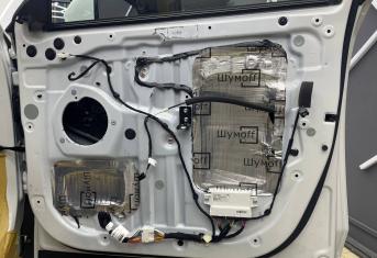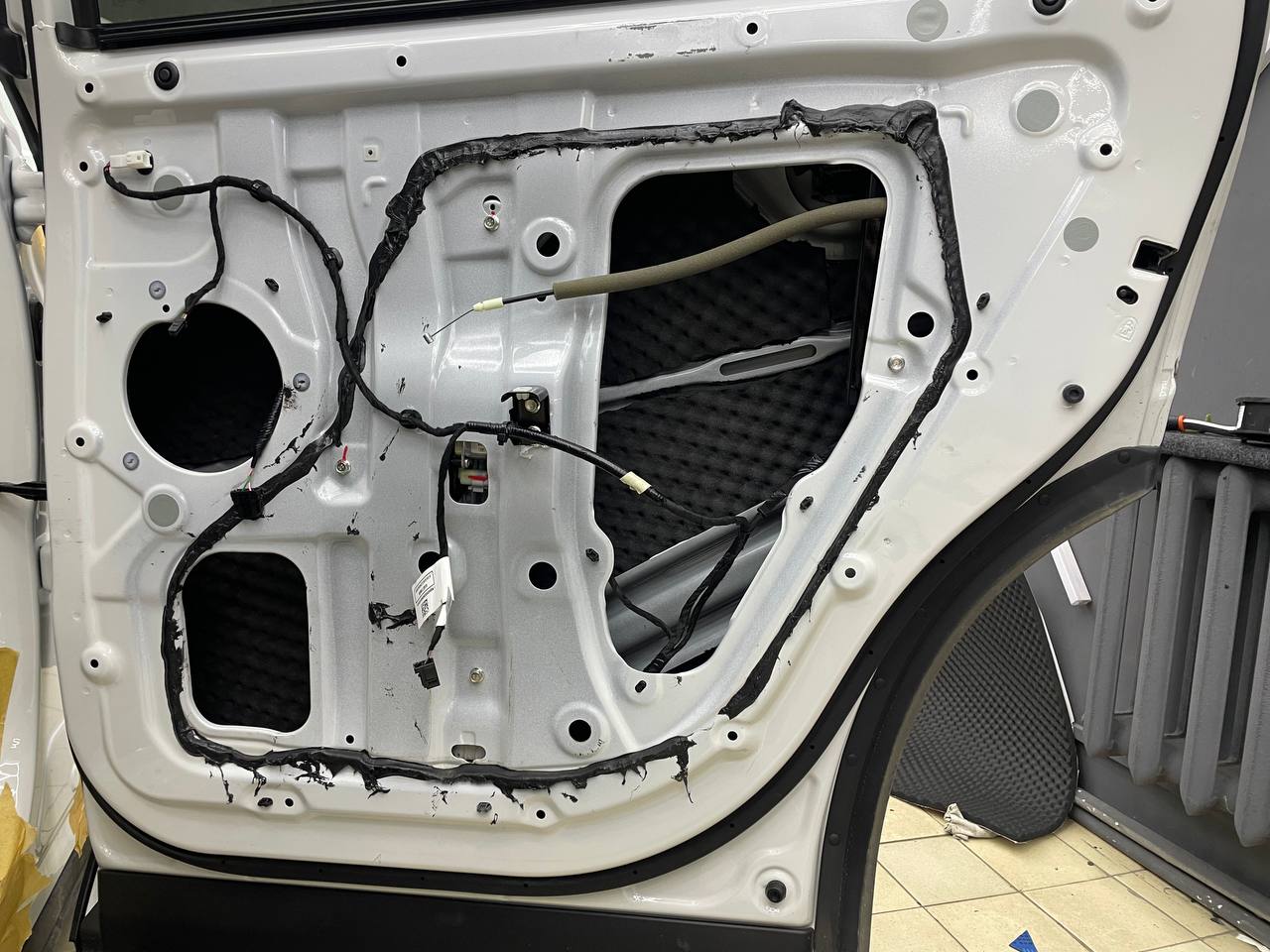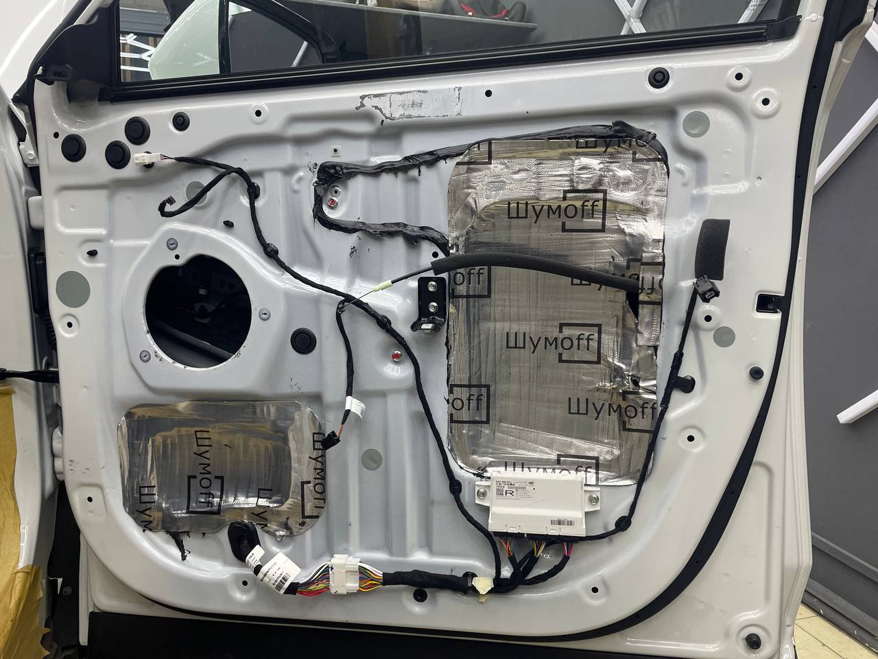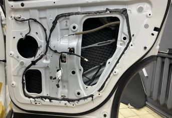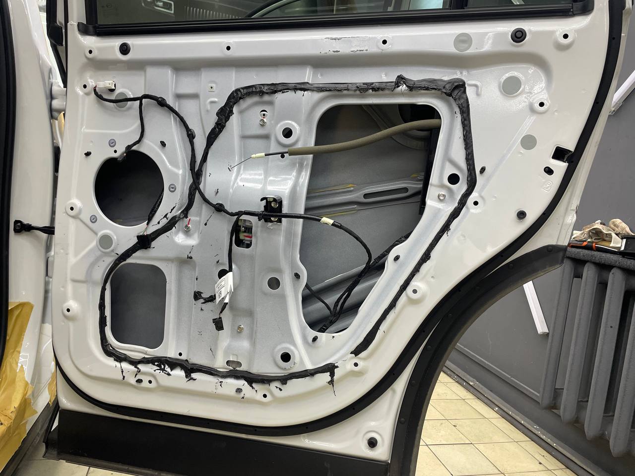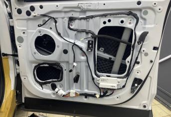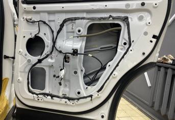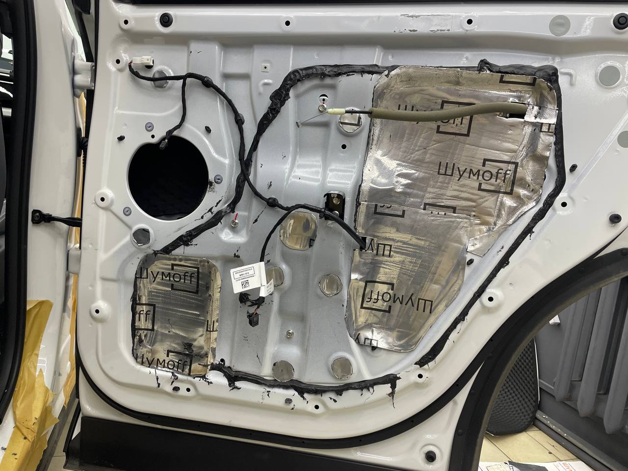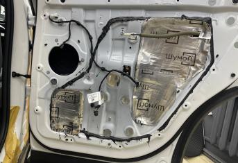 Третьим слоем применяем армирующий материал Шумофф Bass, монтируем его на технологические отверстия и поверх него на вторую стенку двери монтируем виброизоляцию Шумофф Space 2.0, это нам помогает создать максимальную жесткость второй стенки двери на которой расположен динамик, так же по итогу мы получаем закрытый короб двери который очень положительно скажется на звучании аудиосистемы в автомобиле. Саму обшивку двери оклеиваем локально виброизоляцией Шумофф Space 2.0 и полностью закрываем шумопоглощающим материалом Шумофф Герметон А15. Проводку на двери обрабатываем Шумофф Specific. По канту обшивки двери и клипсы обрабатываем Шумофф Absorber 5, чтобы избежать раздражительных звуков и не портить лакокрасочное покрытие.