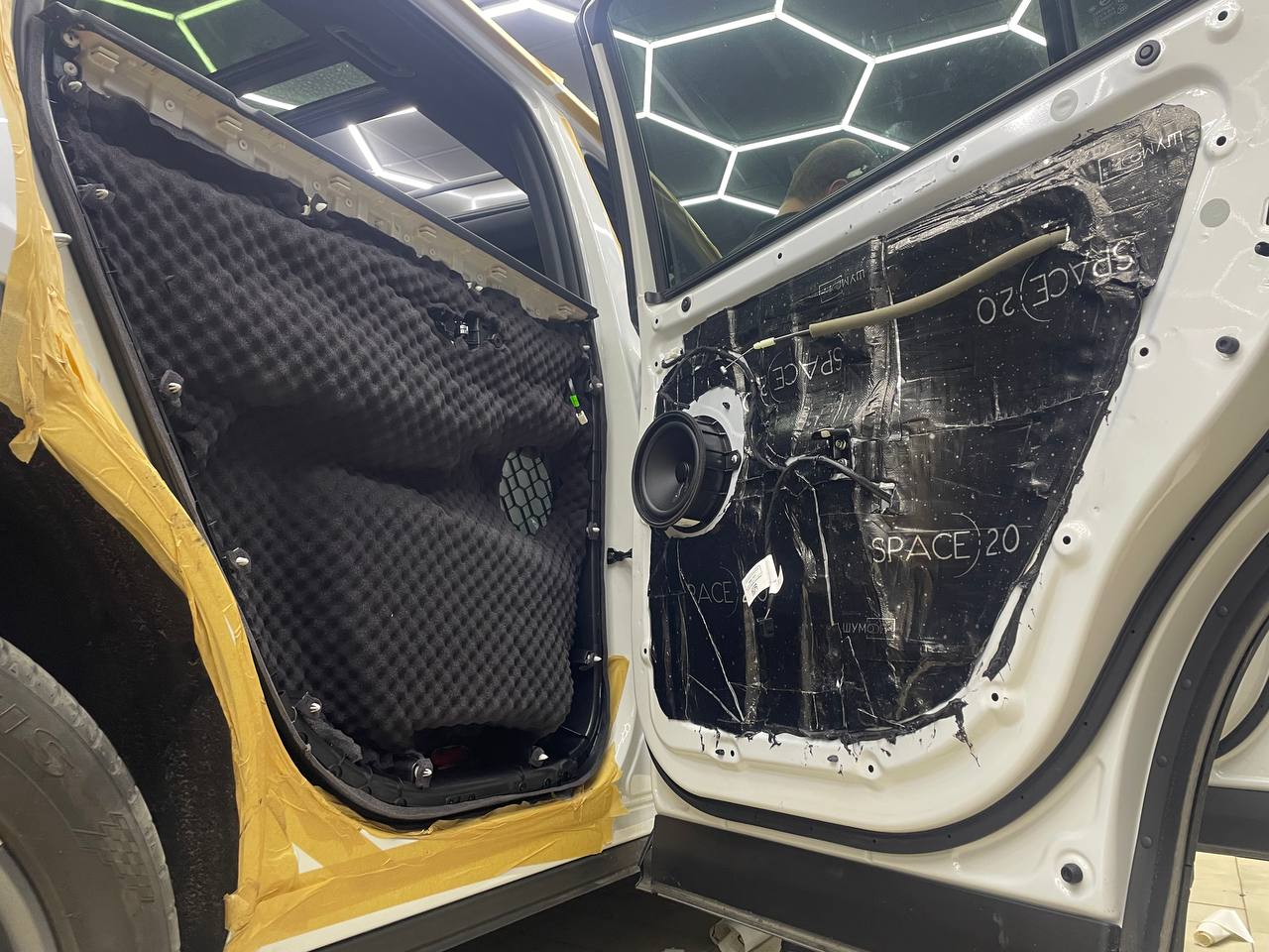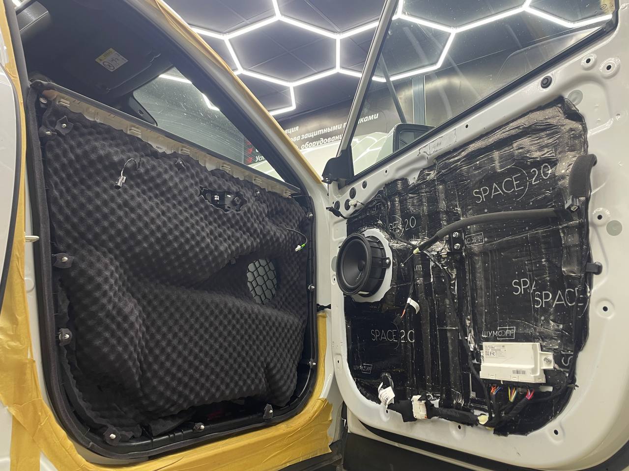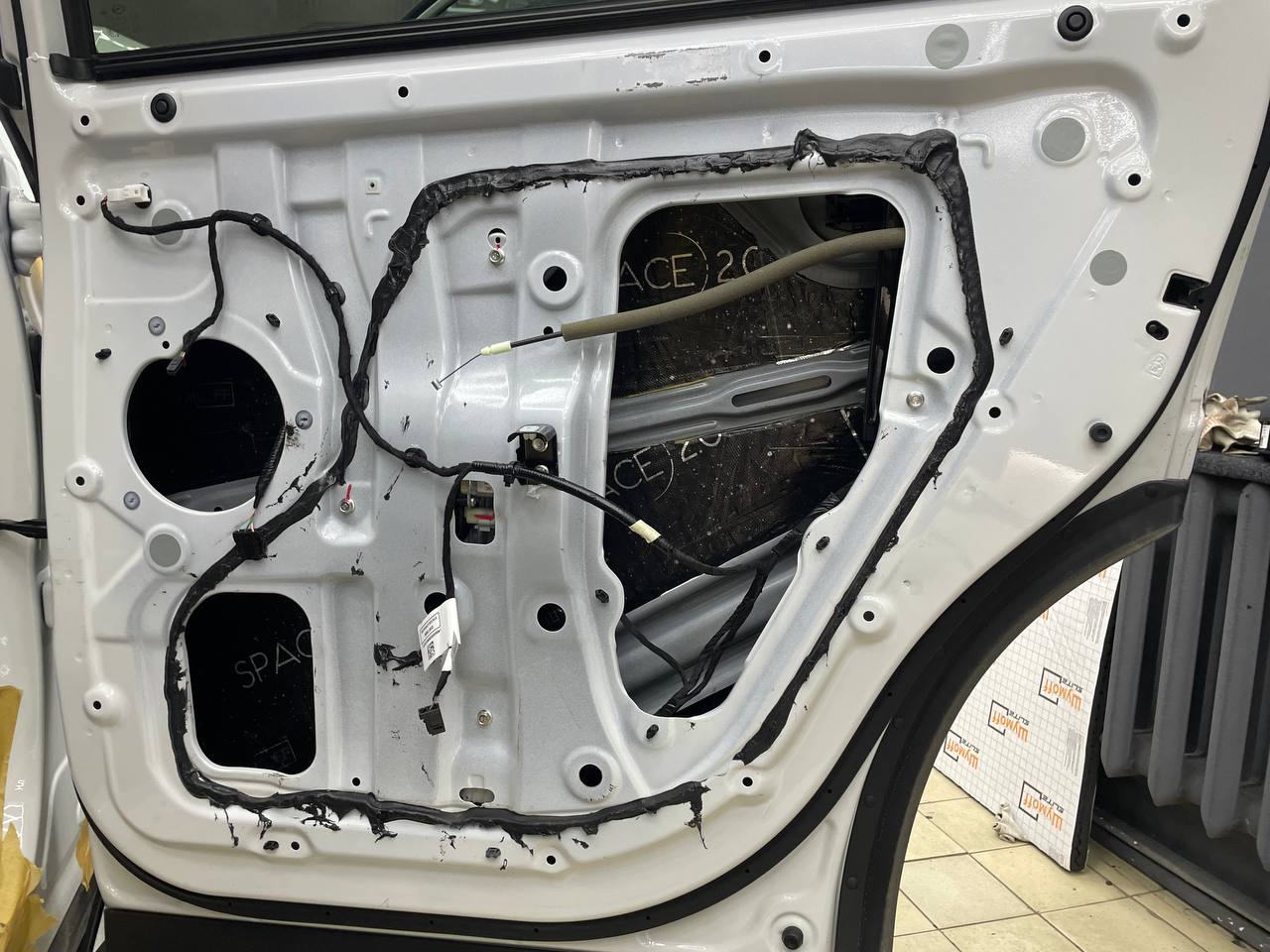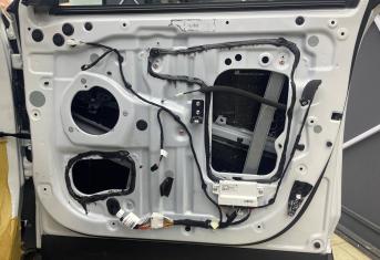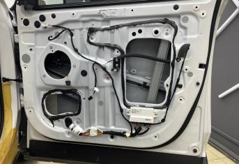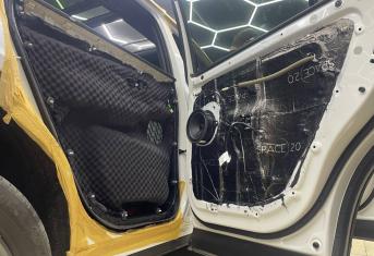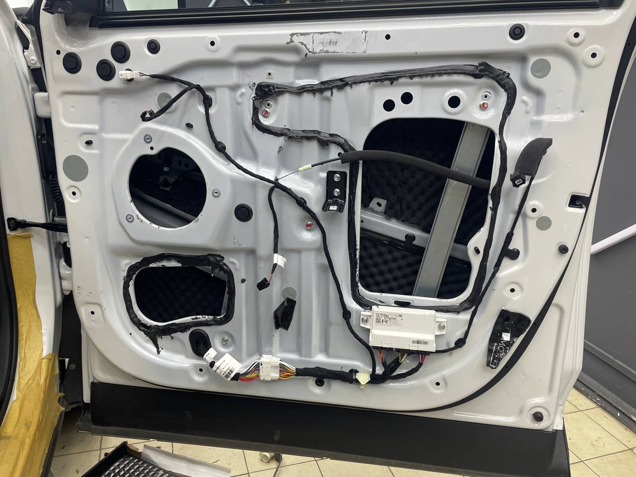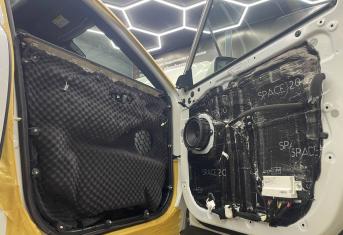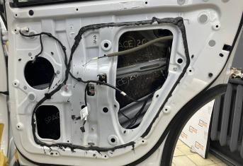 Третьим слоем применяем армирующий материал Шумофф Bass, монтируем его на технологические отверстия и поверх него на вторую стенку двери монтируем виброизоляцию Шумофф Space 2.0, это нам помогает создать максимальную жесткость второй стенки двери на которой расположен динамик, так же по итогу мы получаем закрытый короб двери который очень положительно скажется на звучании аудиосистемы в автомобиле. Саму обшивку двери оклеиваем локально виброизоляцией Шумофф Space 2.0 и полностью закрываем шумопоглощающим материалом Шумофф Герметон А15. Проводку на двери обрабатываем Шумофф Specific. По канту обшивки двери и клипсы обрабатываем Шумофф Absorber 5, чтобы избежать раздражительных звуков и не портить лакокрасочное покрытие.