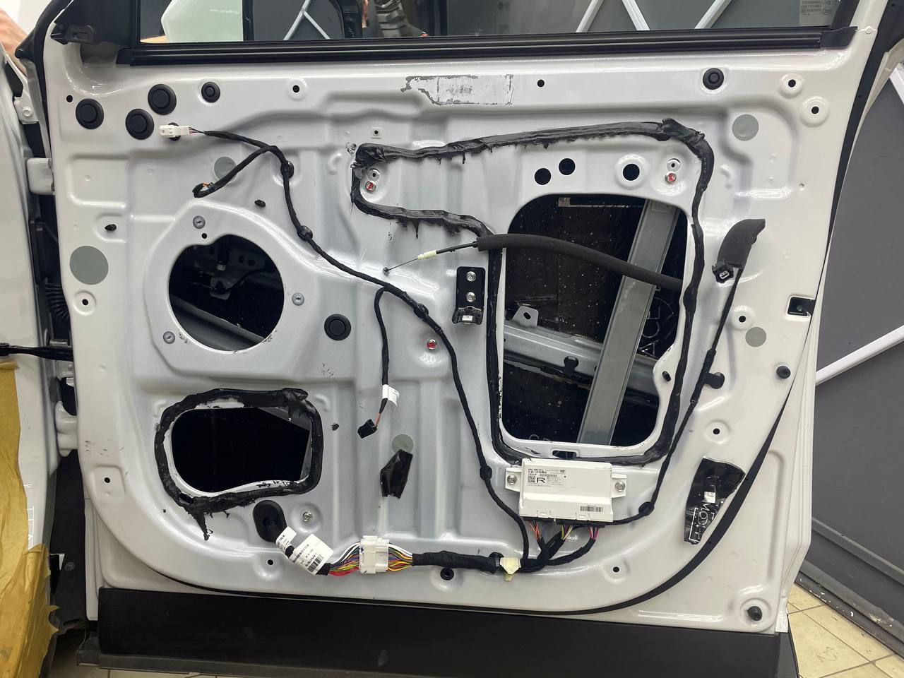 Начинаем работу с разборки дверей, подготавливаем поверхность и обезжириваем. Все работы по демонтажу пластика выполняются специальным инструментом. Мы гарантируем целостность клипс, креплений и отсутствие различного рода царапин на элементах салона.