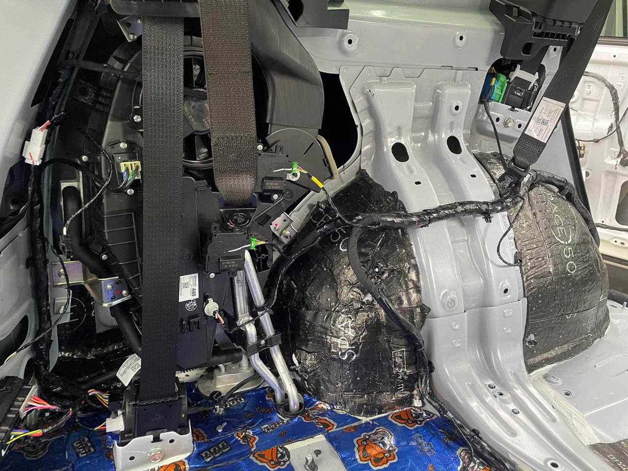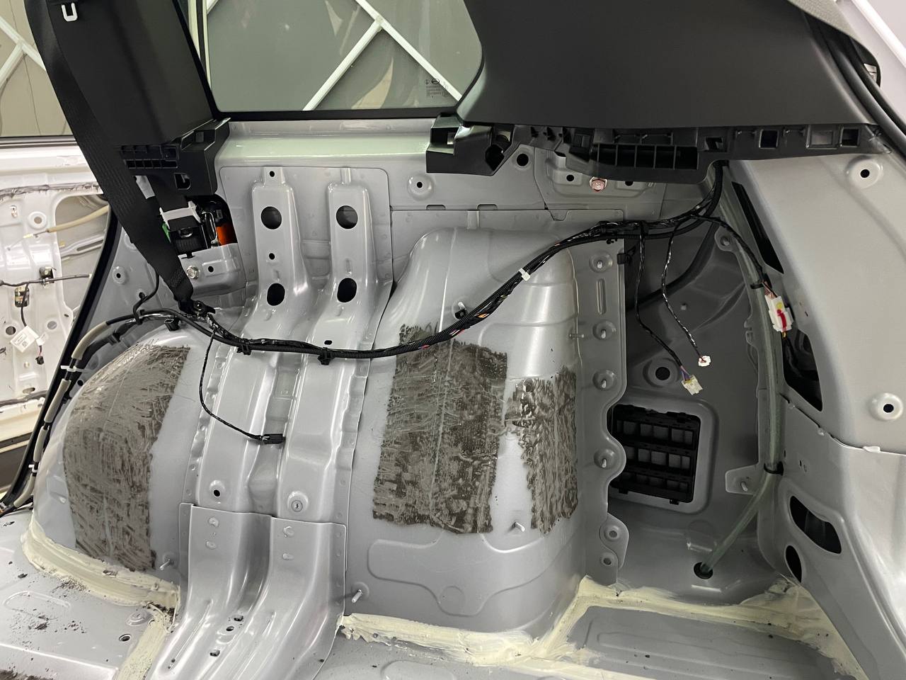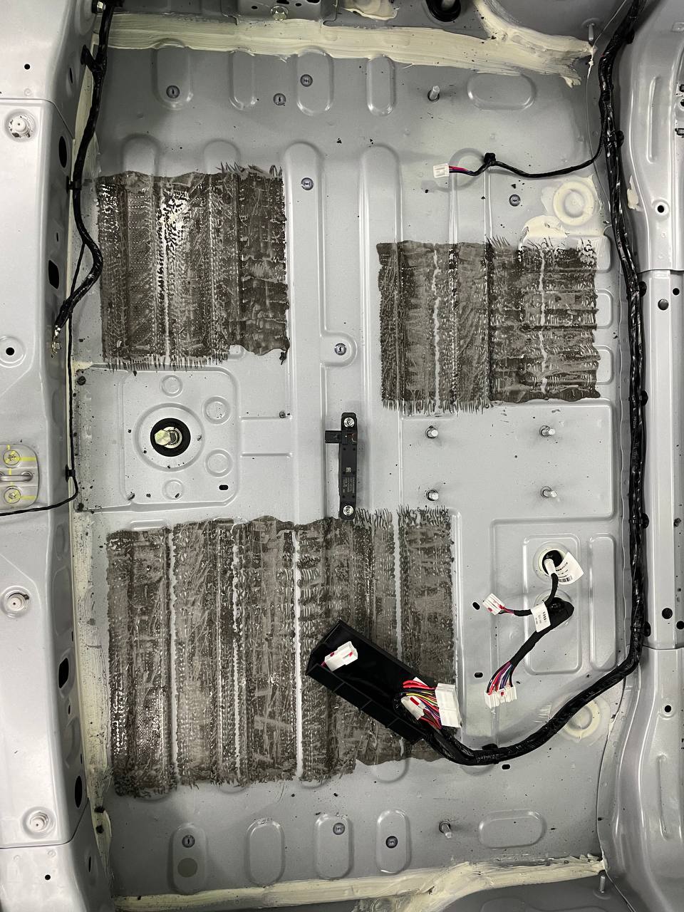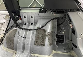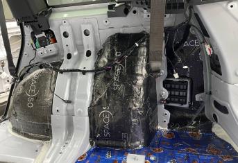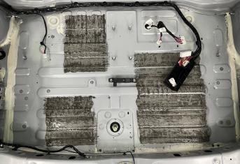Изначально владелец авто жаловался на низкочастотный звук в салоне при движении. Штатная шумоизоляция GAC GS8 состоит только из вибродемпфера, в целом китайский производитель не выделяется по количеству ШВИ. Напыляемую виброизоляцию можно увидеть на полу салона, в нише запасного колеса и на задних арках. Перед началом работ мы в обязательном порядке производим проверку качества монтажа заводского вибродемпфера с помощью специального инструмента. Смотрите фото салона после полного разбора ниже.