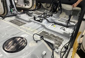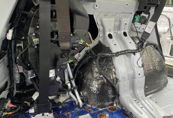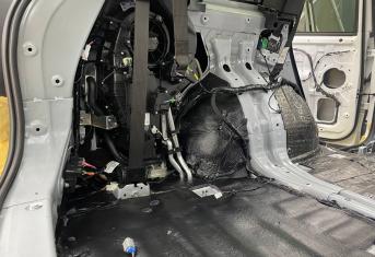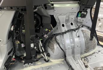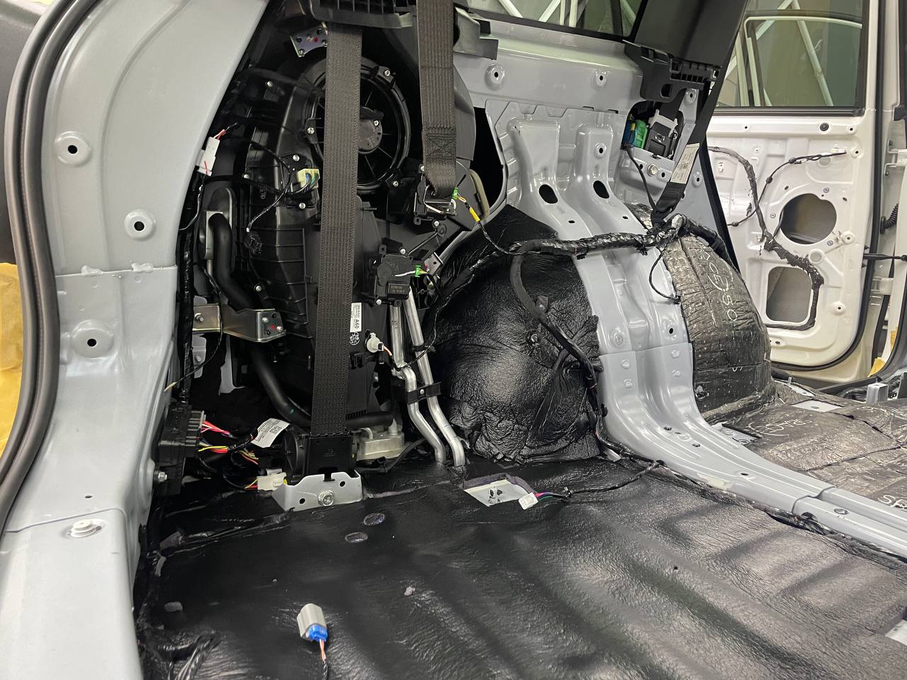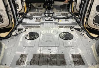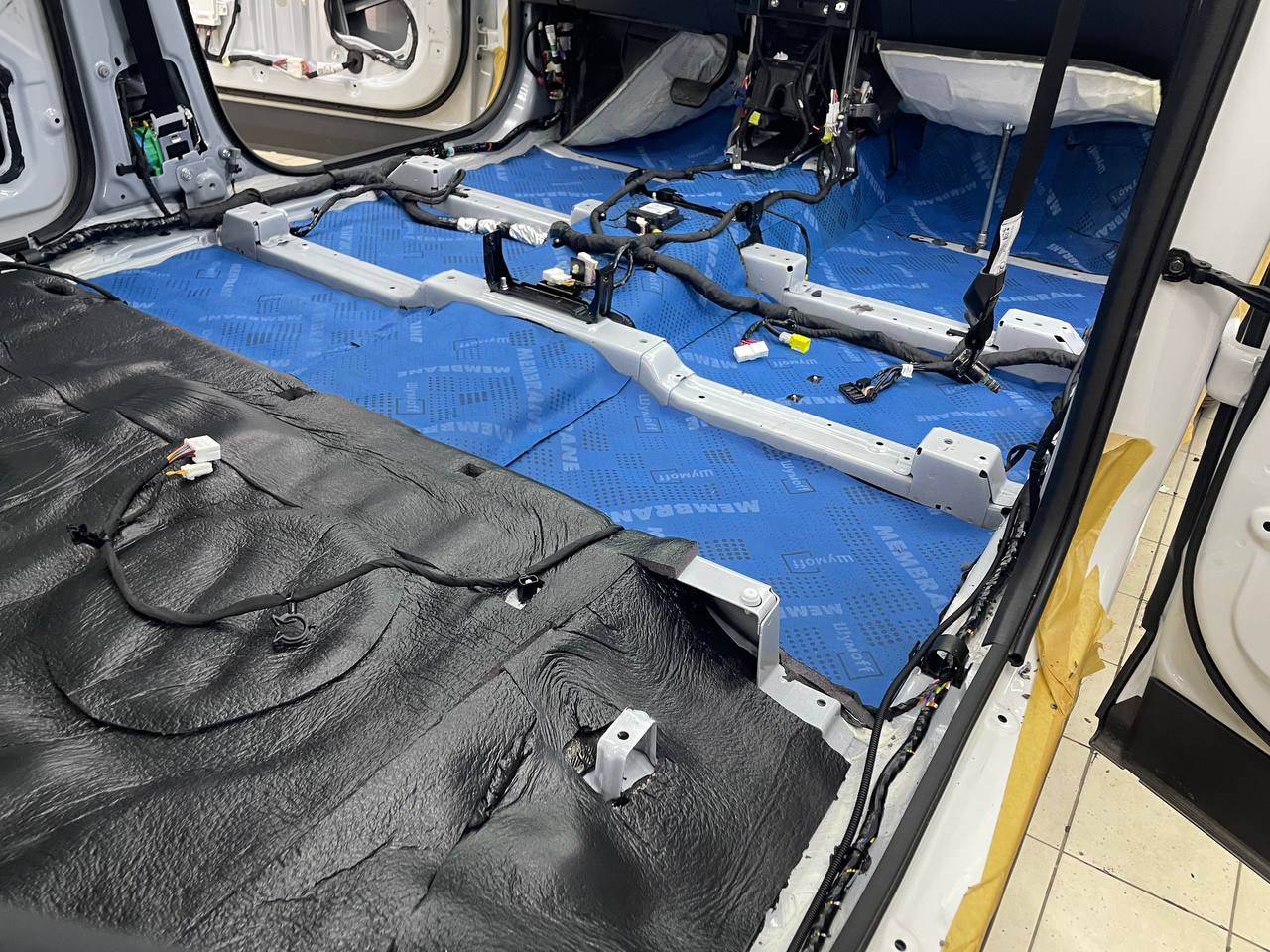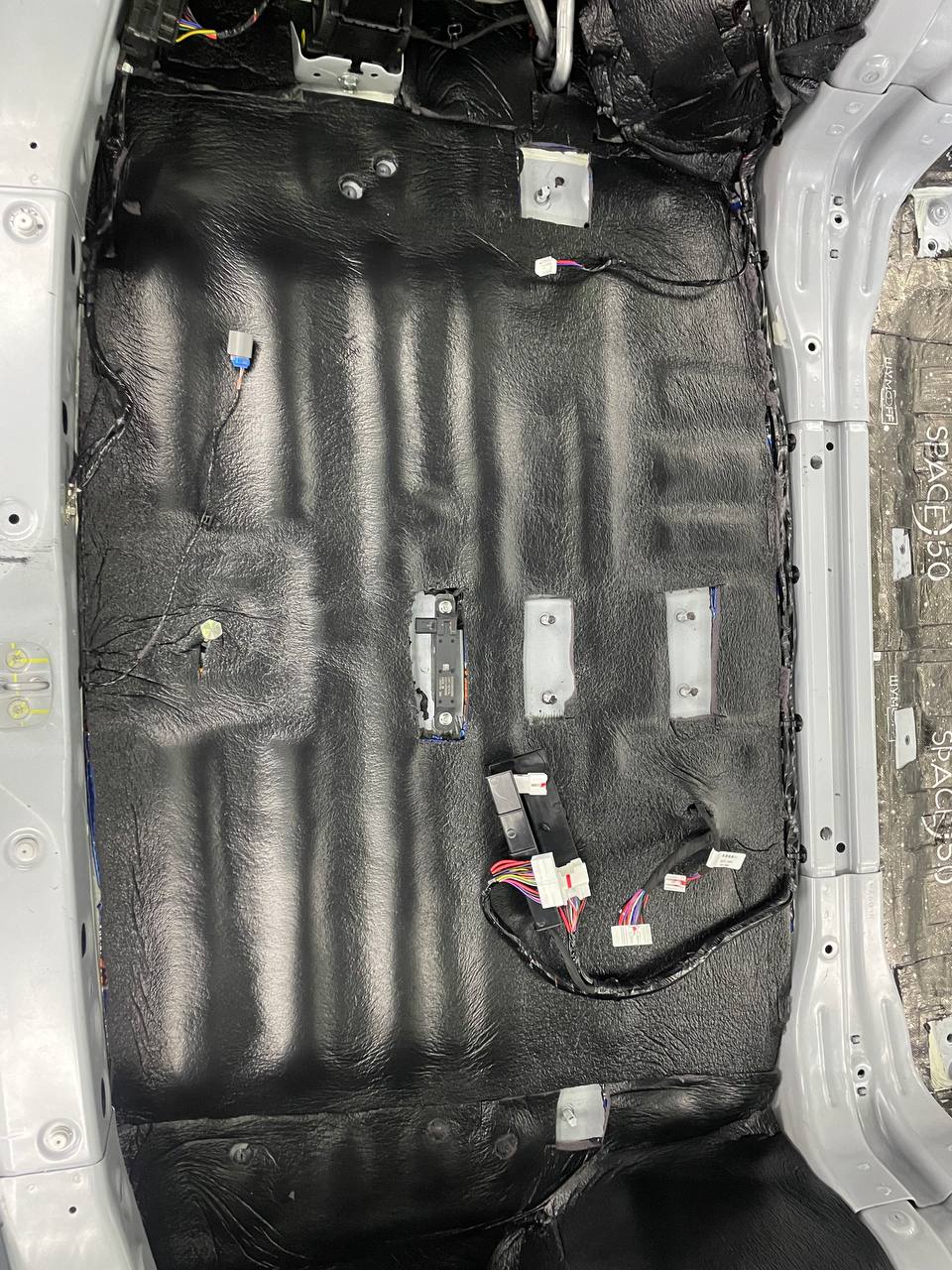 Изначально владелец авто жаловался на низкочастотный звук в салоне при движении. Штатная шумоизоляция GAC GS8 состоит только из вибродемпфера, в целом китайский производитель не выделяется по количеству ШВИ. Напыляемую виброизоляцию можно увидеть на полу салона, в нише запасного колеса и на задних арках. Перед началом работ мы в обязательном порядке производим проверку качества монтажа заводского вибродемпфера с помощью специального инструмента. Смотрите фото салона после полного разбора ниже.