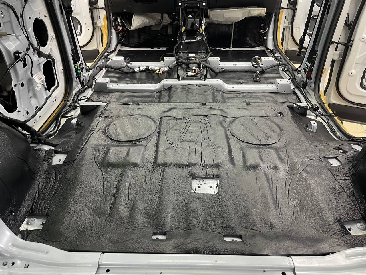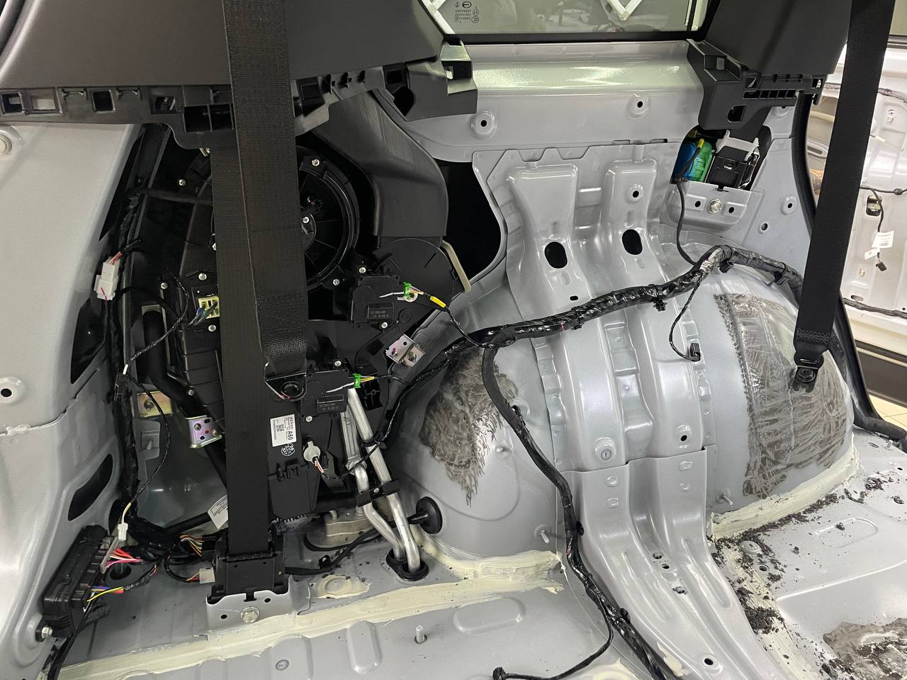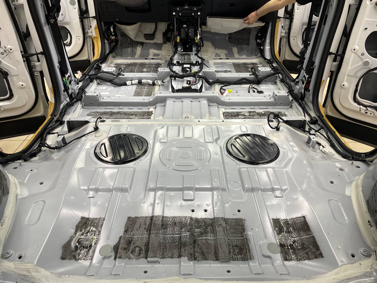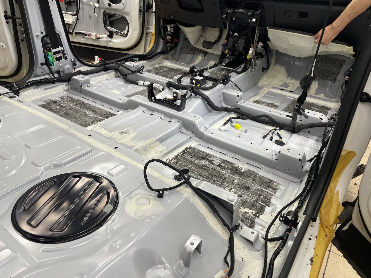 Приступаем к работам с полом и салоном авто. На разборку всего салона уходит около 1 часа. После чего мы подготавливаем поверхность, очистив ее от пыли и предварительно обезжирив.