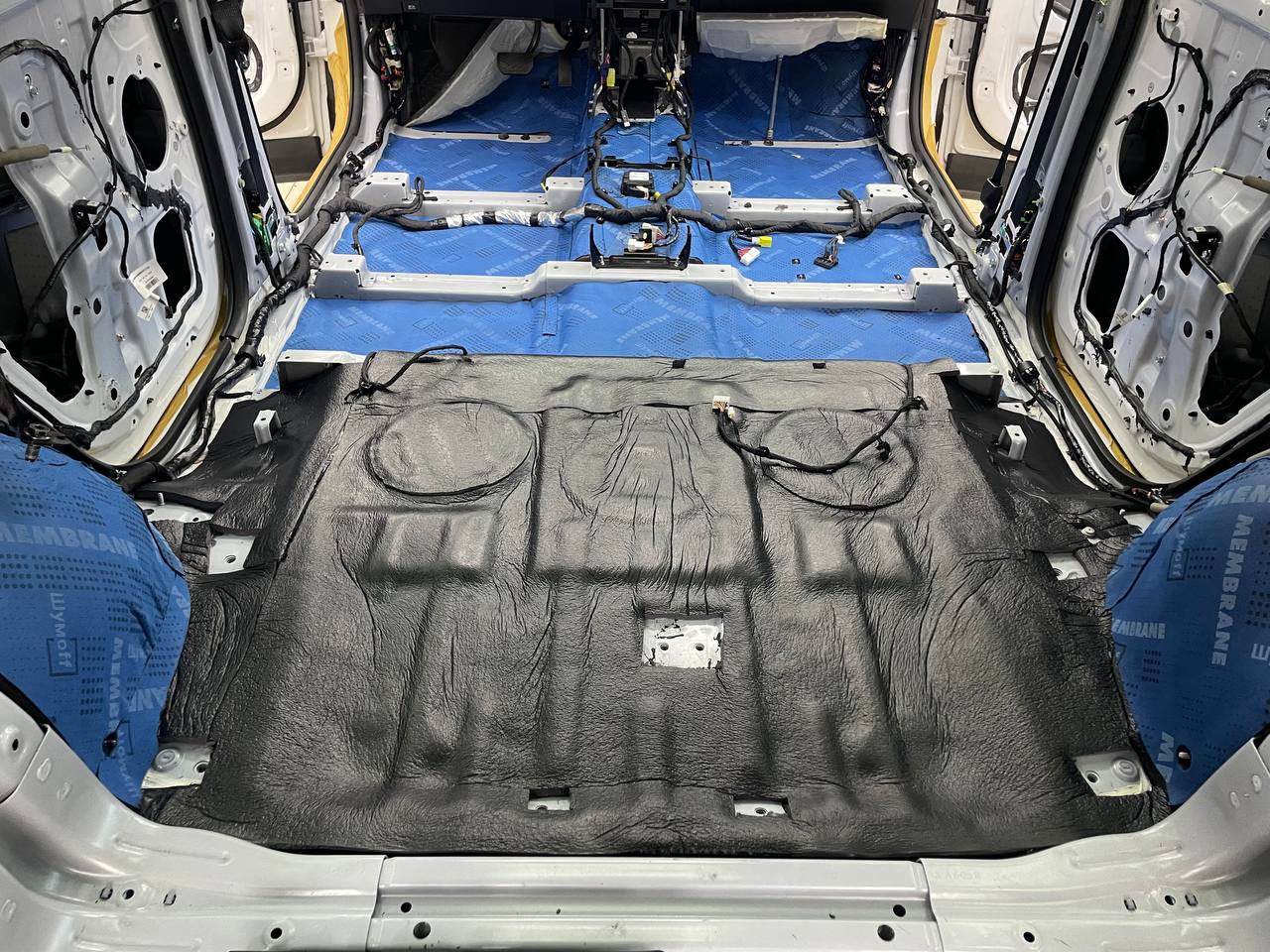 Третий слой – укладываем новую звукоотражающую мембрану Шумофф Membrane так же от максимального подворота под торпеду и по всей плоскости пола до подъема задних сидений, а так же на задние арки в багажнике.