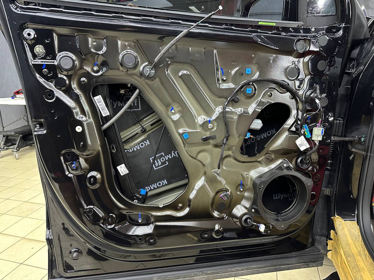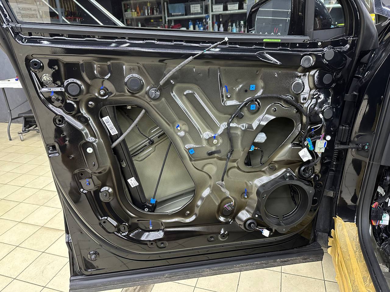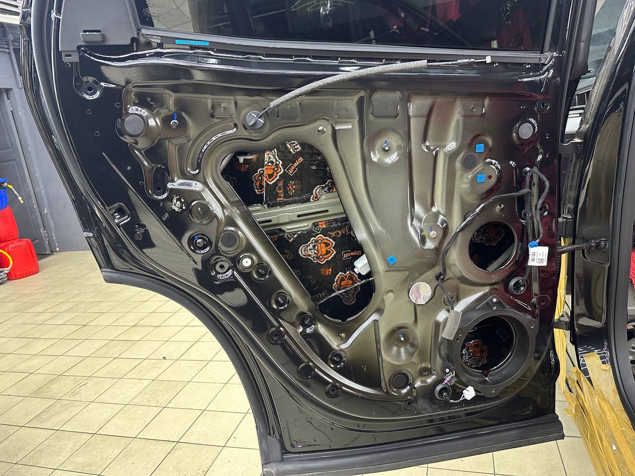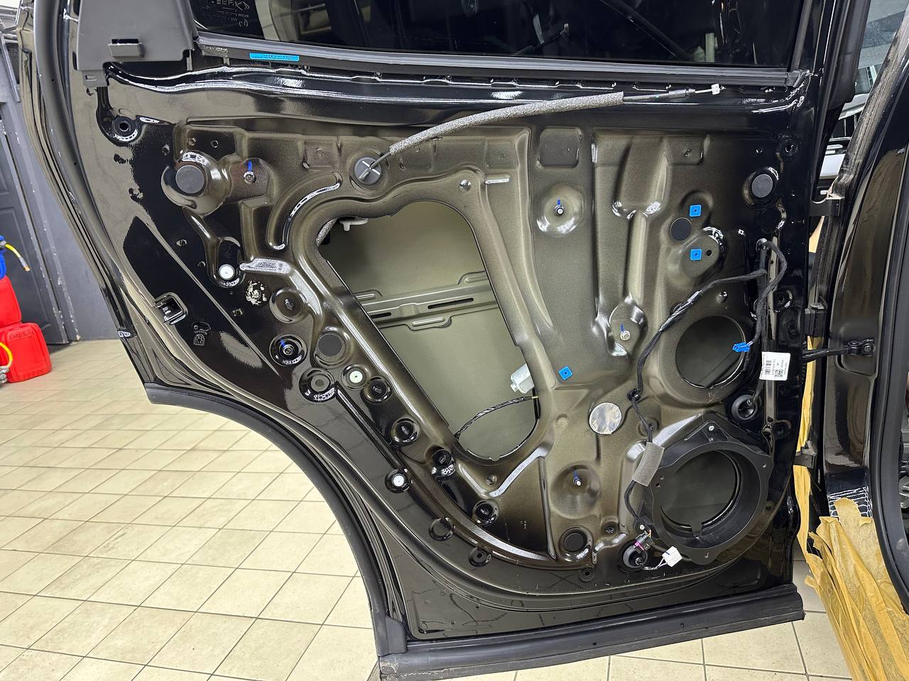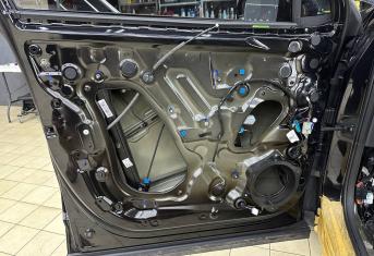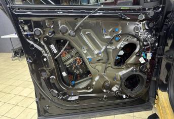 Начинаем работу с разборки дверей, подготовки поверхности и обезжириванию. Все работы по демонтажу пластика выполняются специальным инструментом. Мы гарантируем целостность клипс, креплений и отсутствие различного рода царапин, задиров на обшивках.