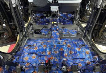 Третьим слоем применяем виброизоляцию Шумофф Jack на внутреннюю стенку двери. Проводку частично обрабатываем Шумофф Specific. Саму обшивку двери оклеиваем виброизоляцией Шумофф Jack и полностью закрываем шумопоглощающим материалом Шумофф Absorber А15. Обратите внимание, как тщательно мы обрабатываем двери виброизоляцией и шумопоглотителем - мы не экономим материал и щедро укладываем его в необходимые места. По канту обшивки двери и клипсы укладываем Шумофф Absorber 5, чтобы избежать раздражительных звуков и не портить ЛКП.