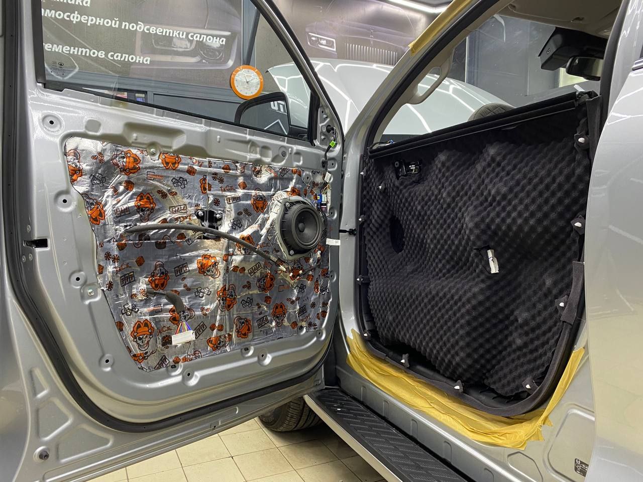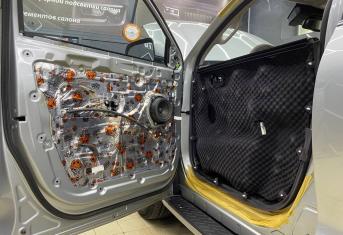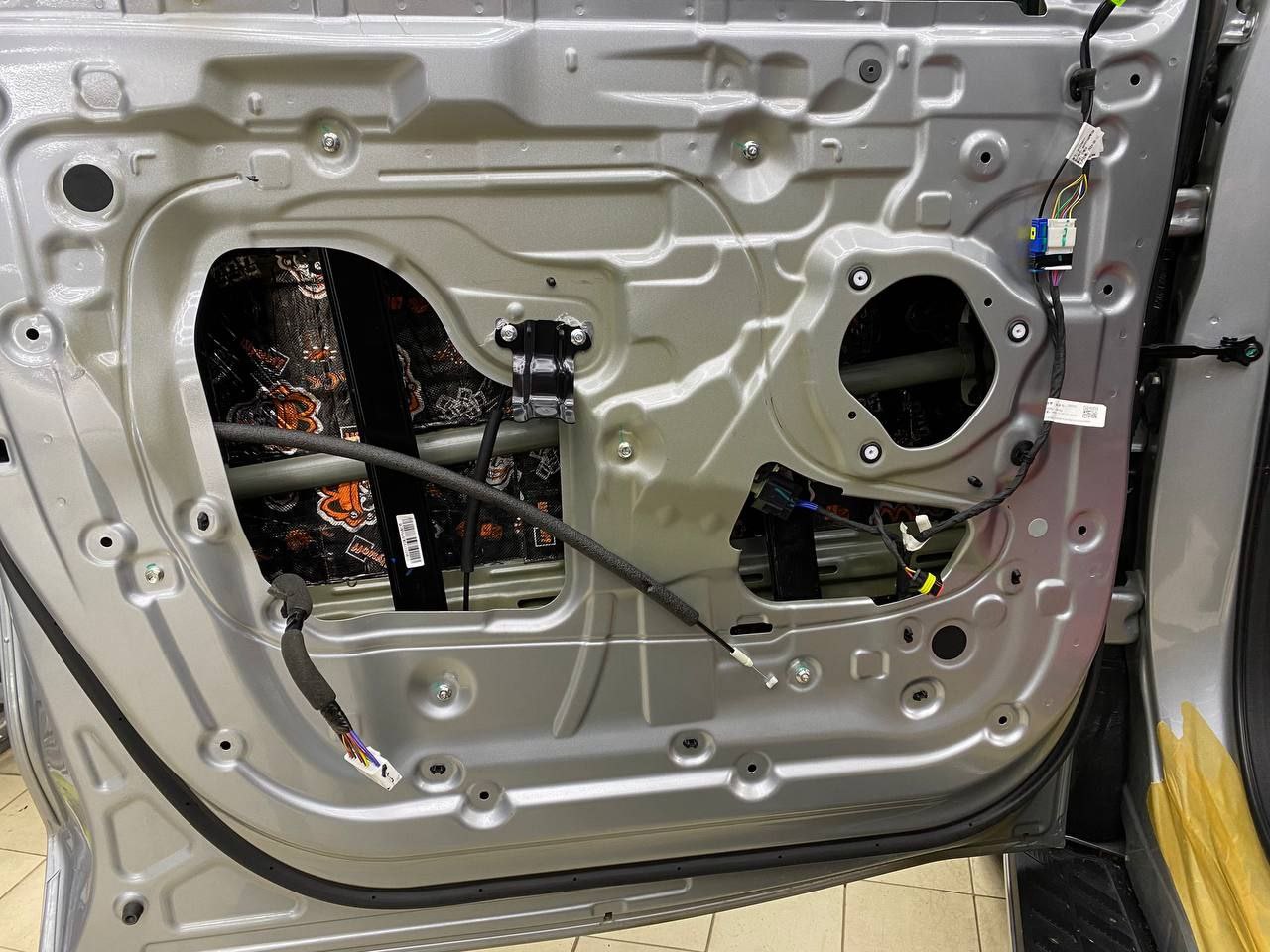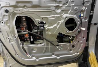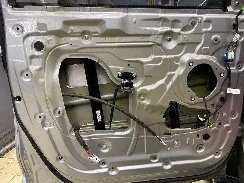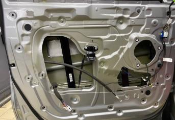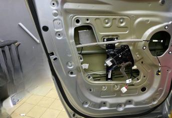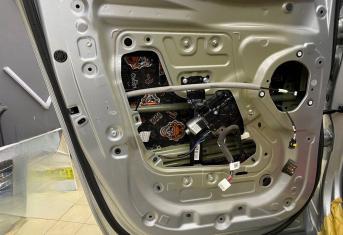 Начинаем работу с разборки дверей, подготовки поверхности и обезжириванию. Все работы по демонтажу пластика выполняются специальным инструментом. Мы гарантируем целостность клипс, креплений и отсутствие различного рода царапин, задиров на обшивках.