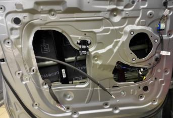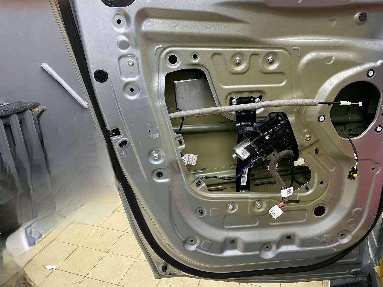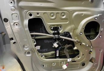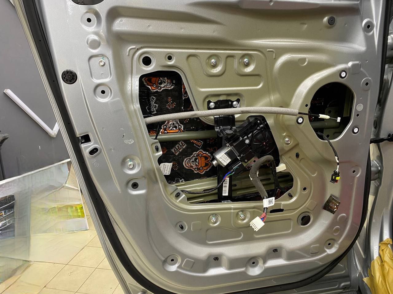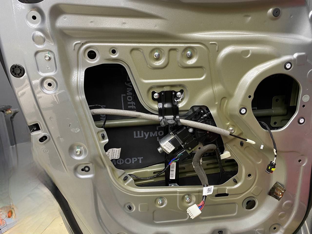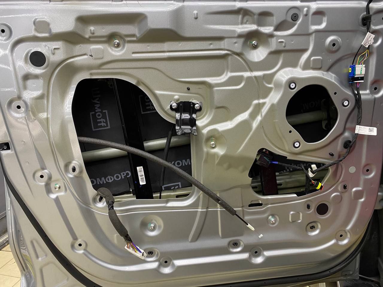 Третьим слоем применяем виброизоляцию Шумофф Jack на внутреннюю стенку двери и пластиковый щит. Проводку частично обрабатываем Шумофф Specific. Саму обшивку двери локально оклеиваем виброизоляцией Шумофф Jack и полностью закрываем шумопоглощающим материалом Шумофф Герметон А15. Обратите внимание, как тщательно мы обрабатываем двери виброизоляцией и шумопоглотителем - мы не экономим материал и щедро укладываем его в необходимые места. По канту обшивки двери и клипсы укладываем Шумофф Absorber 5, чтобы избежать раздражительных звуков и не портить ЛКП.
