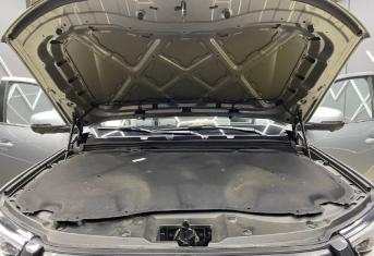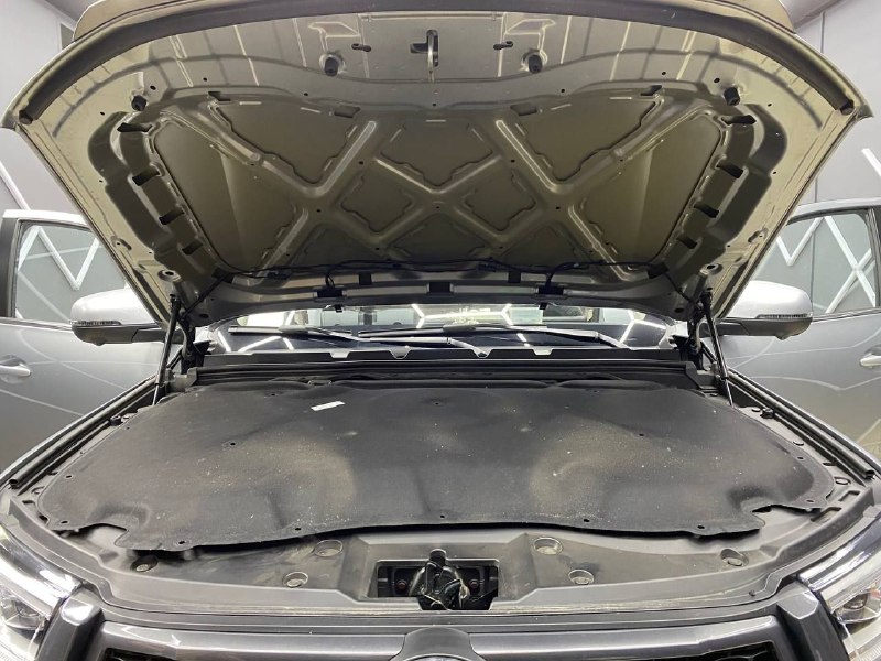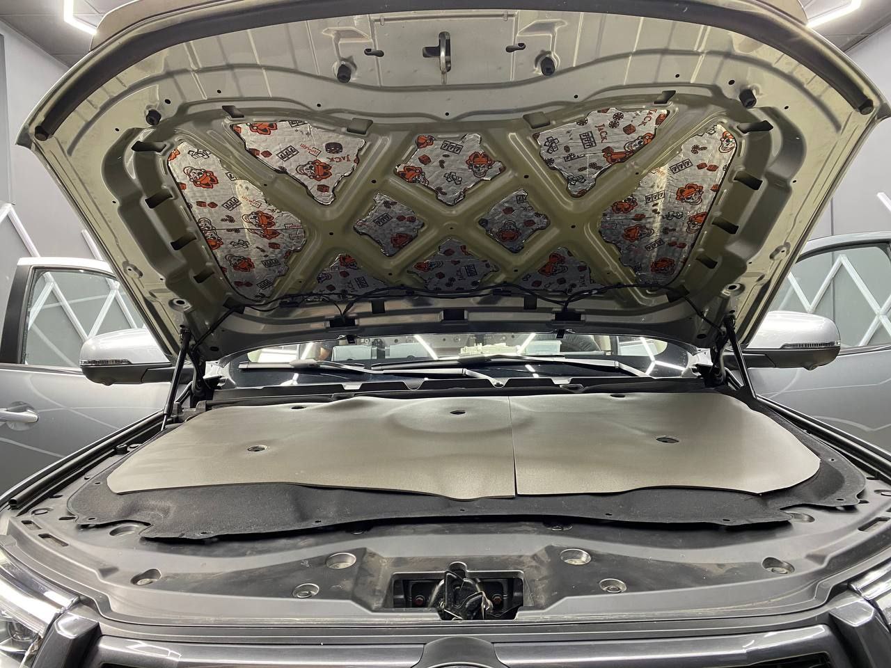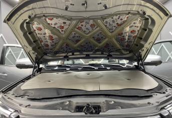 В технологические отверстия капота, на внешний металл, Шумофф Jack и на штатную обивку шумо-теплоизоляция Practik Base 4.