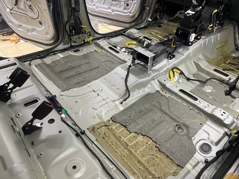 Приступаем к работам с полом – самой громкой и вибронагруженной частью автомобиля. На разборку салона уходит около 2-3 часов. После чего мы подготавливаем поверхность, очистив ее от пыли и предварительно обезжирив.