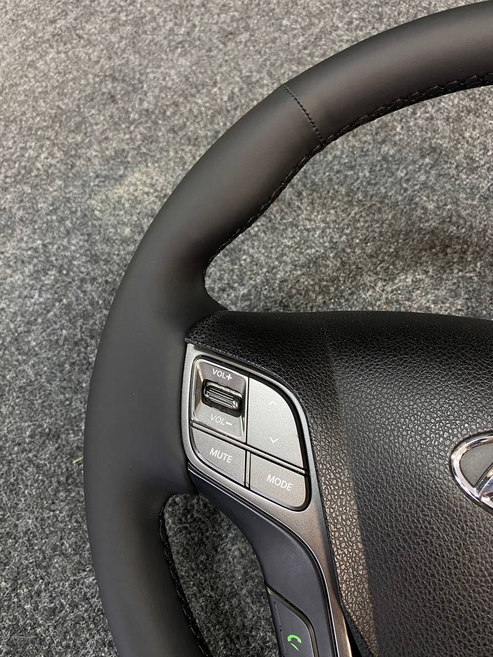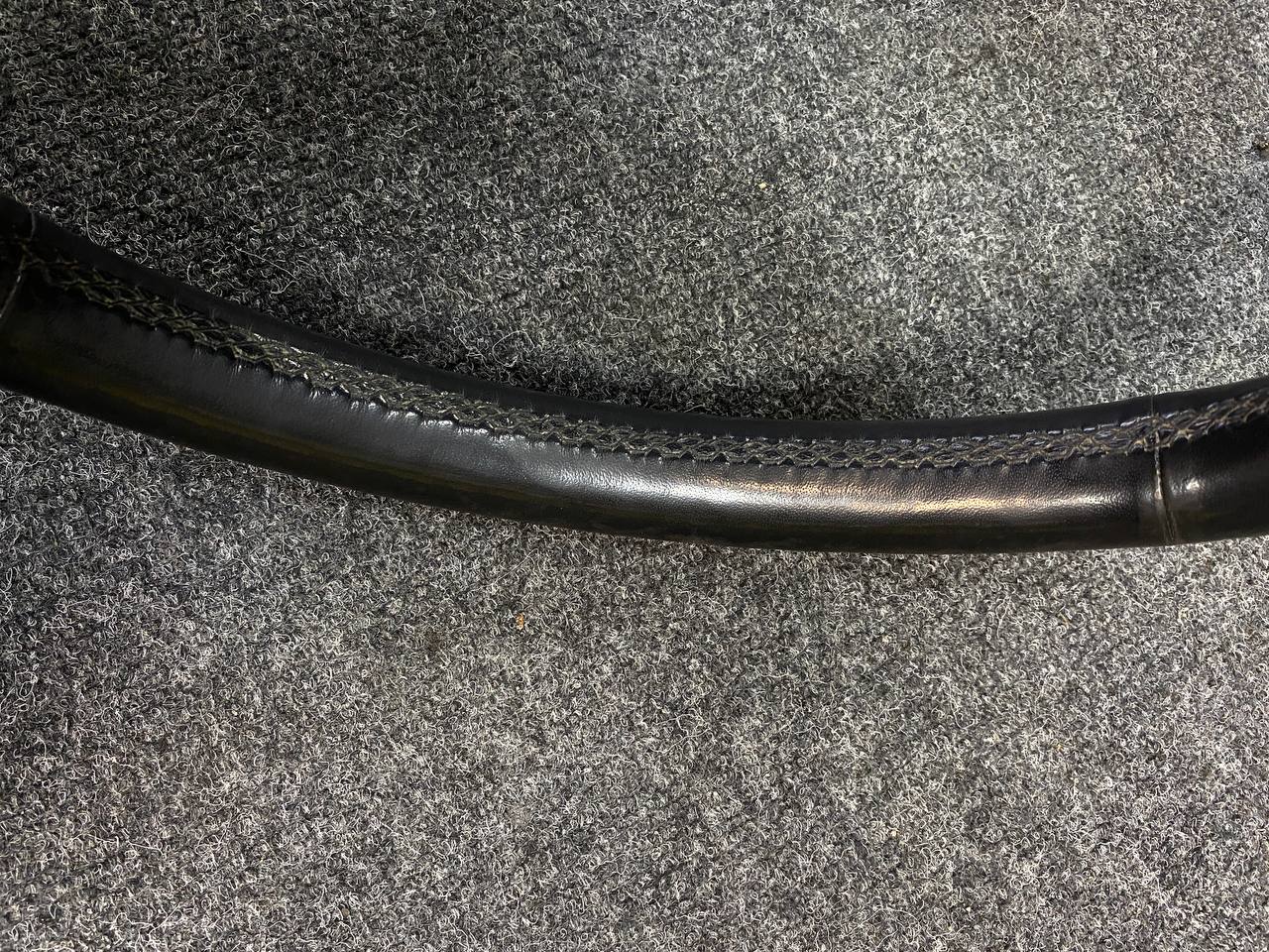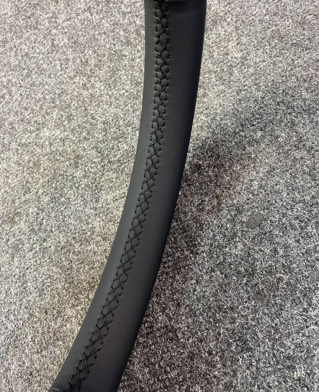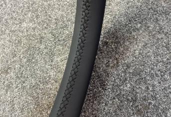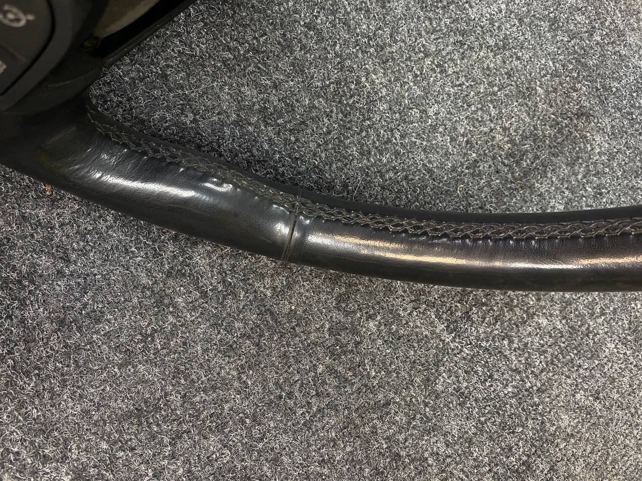 Как и в шумоизоляции авто, в пошиве мы используем исключительно оригинальные материалы, которые используются в отделке премиальных автомобилей. Основная причина: очень дорого выходит переделка. А учитывая, что автомобиль часто эксплуатируется и на материал воздействуют не только солнечные лучи и температура, но и механические нагрузки. На этом руле мы применили натуральную кожу итальянского производства. Руль после этого очень стильно смотрится в салоне авто. Клей и зеленые нити также оригинальные, мы не экономим на мелочах.