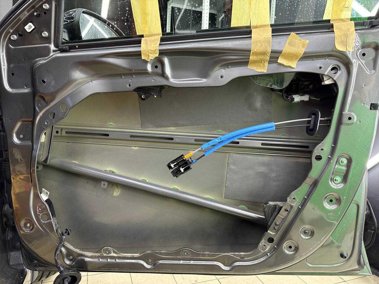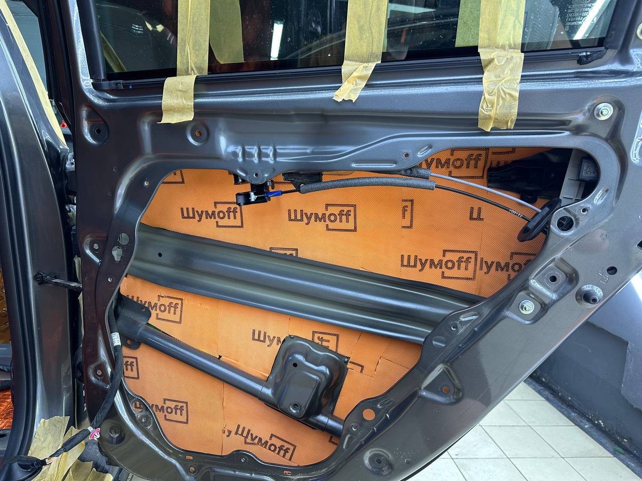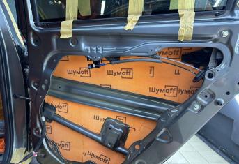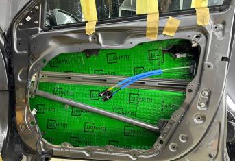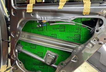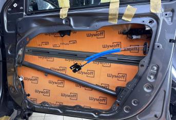 Вторую стенку двери и пластиковый щит обрабатываем Шумофф М2. Саму обшивку двери оклеиваем виброизоляцией Шумофф PRACTIK 1.6 и полностью закрываем шумопоглощающим материалом Шумофф Absorber А15. По канту обшивки двери и клипсы обрабатываем уплотнительным материалом Шумофф Absorber 5, а открытую проводку и тросики обрабатываем Шумофф Specific.