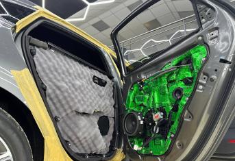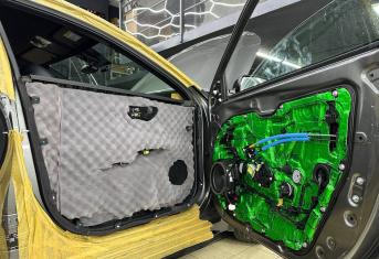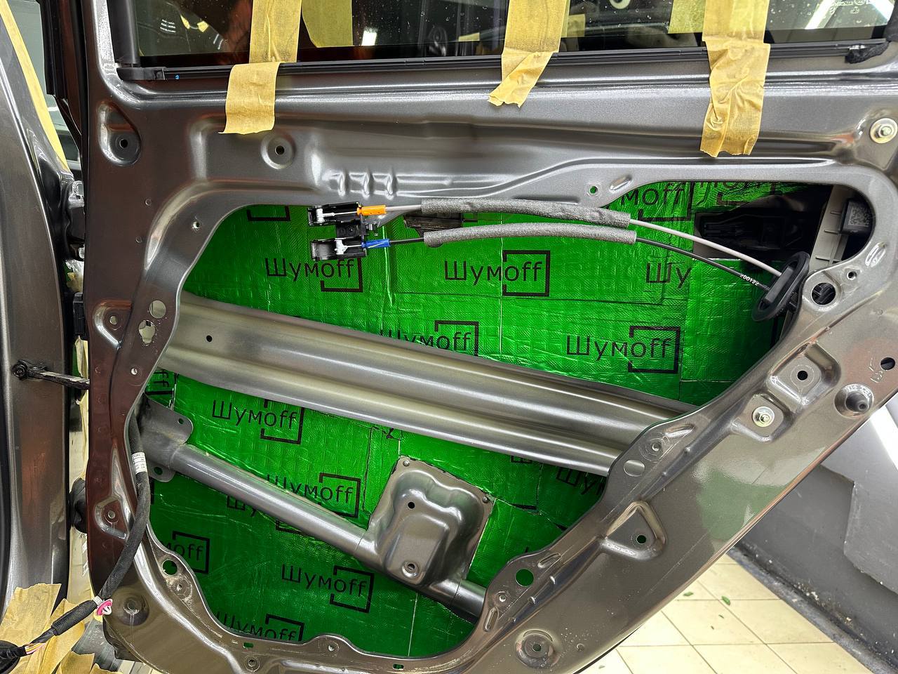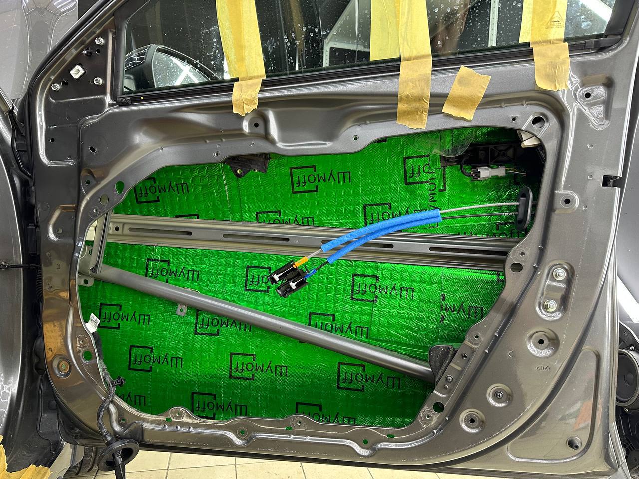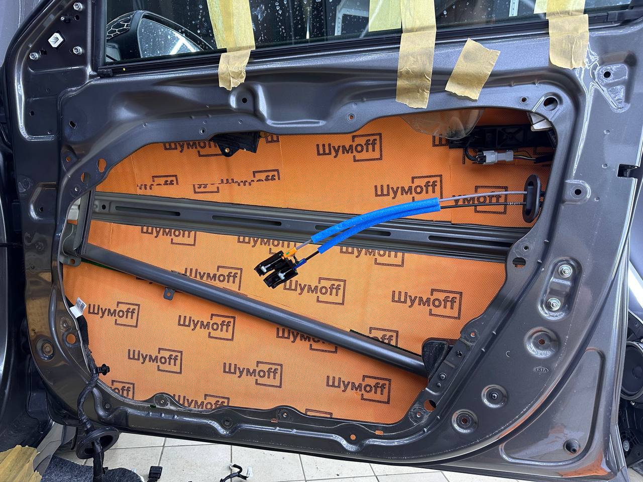Вторую стенку двери и пластиковый щит обрабатываем Шумофф М2. Саму обшивку двери оклеиваем виброизоляцией Шумофф PRACTIK 1.6 и полностью закрываем шумопоглощающим материалом Шумофф Absorber А15. По канту обшивки двери и клипсы обрабатываем уплотнительным материалом Шумофф Absorber 5, а открытую проводку и тросики обрабатываем Шумофф Specific.