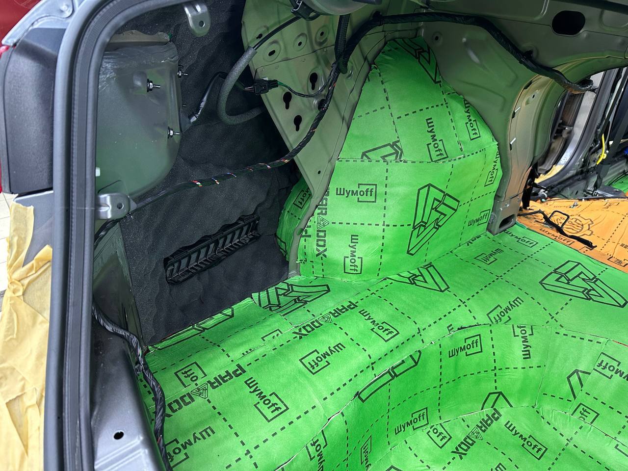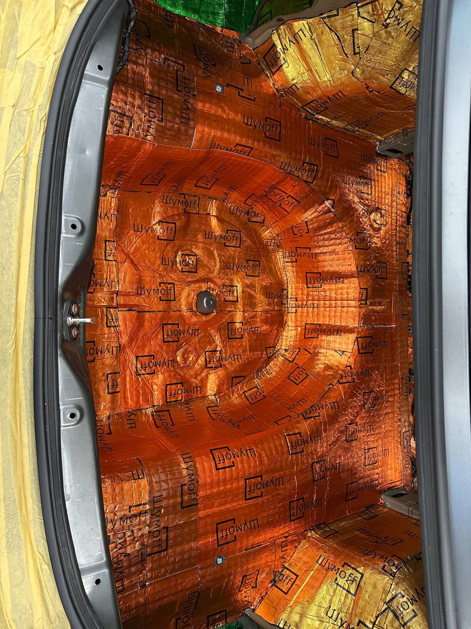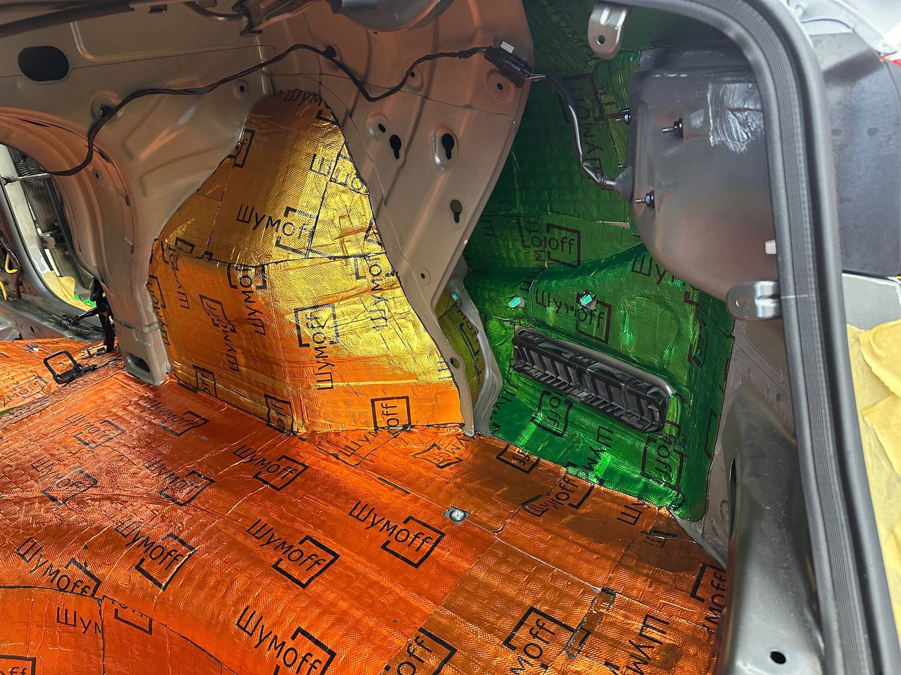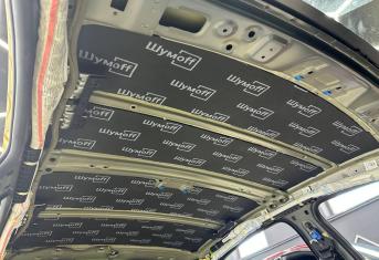 На крышку багажника укладываем Шумофф М2. На обшивку шумопоглатитель Герметон 7. По канту и клипсы укладываем Шумофф Absorber 5, а на открытую проводку Шумофф Specific.