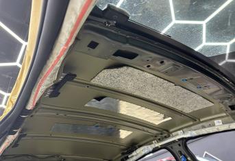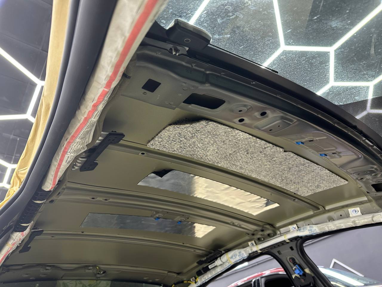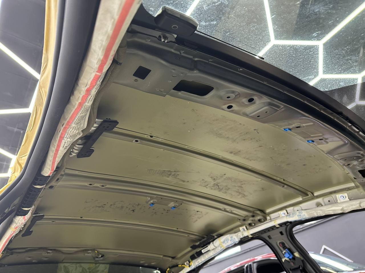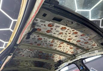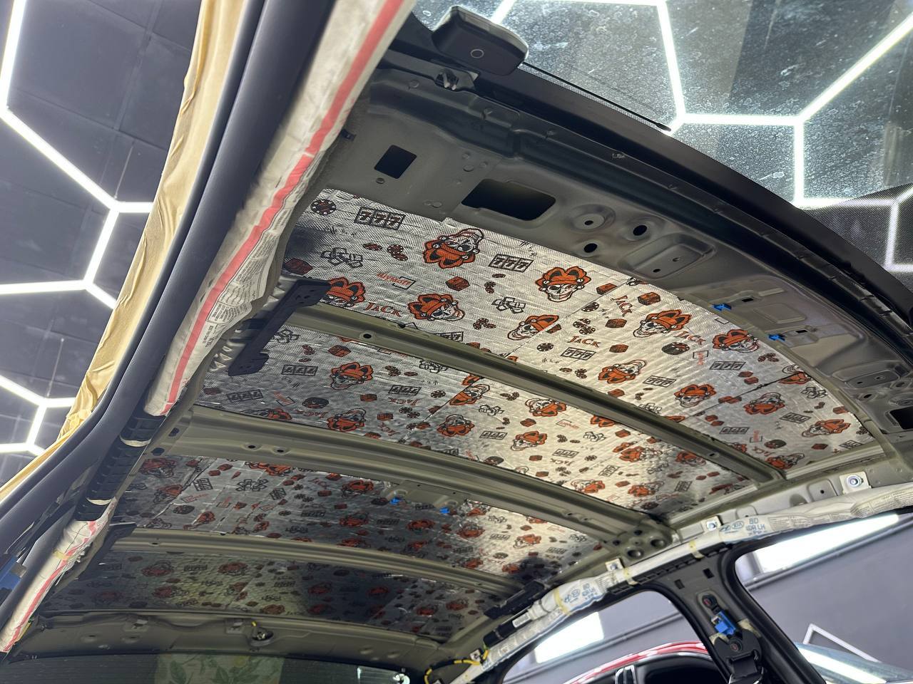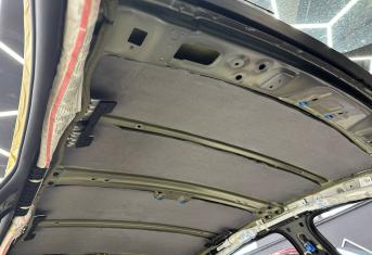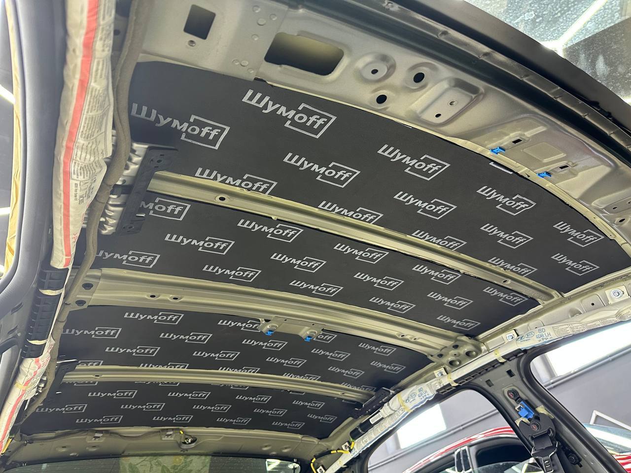 Первым слоем на крышу монтируем виброизоляцию Шумофф Jack. Второй слой шумо-теплоизоляция Practik Base 4. Сверху всё покрывается шумопоглотителем Шумофф Герметон 7. Все материалы плотно прикатываются валиком по ровным плоскостям, исключая усилители и попадание воздуха.