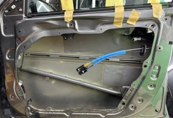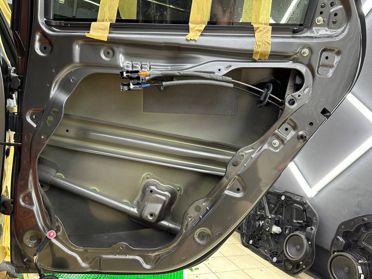 Начинаем с разборки дверей, подготовки поверхности и обезжириванию. Все работы по демонтажу пластика выполняются специальным инструментом. Мы гарантируем целостность клипс, креплений и отсутствие различного рода царапин, задиров на обшивках.