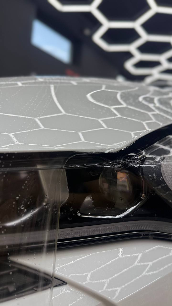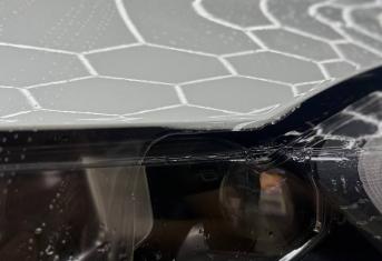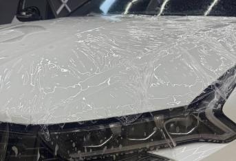 В работе применяем полиуретановую пленку NAR, толщиной 190 микрон. Эта пленка обладает функцией самовосстановления небольших царапин при высокой температуре. Клиент выбрал для своего автомобиля пакет Трасса, что подразумевает оклейку передней части кузова и оптики.