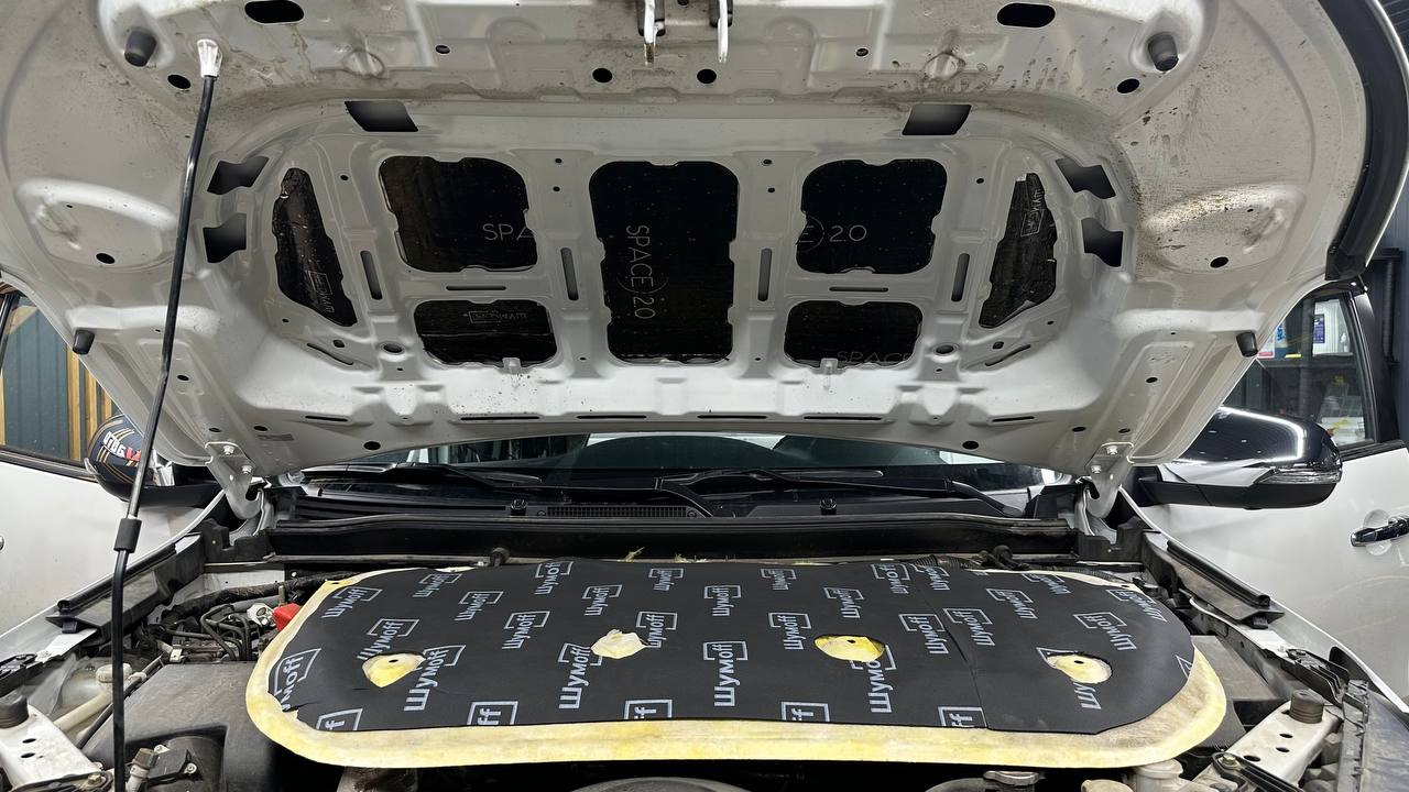 В технологические отверстия капота монтируем Шумофф Space 2.0, а на штатную обивку шумо-теплоизоляцию Комфорт 3.