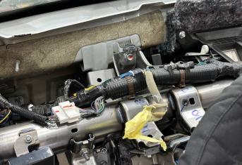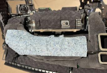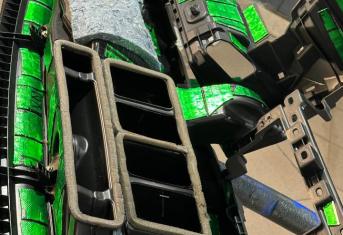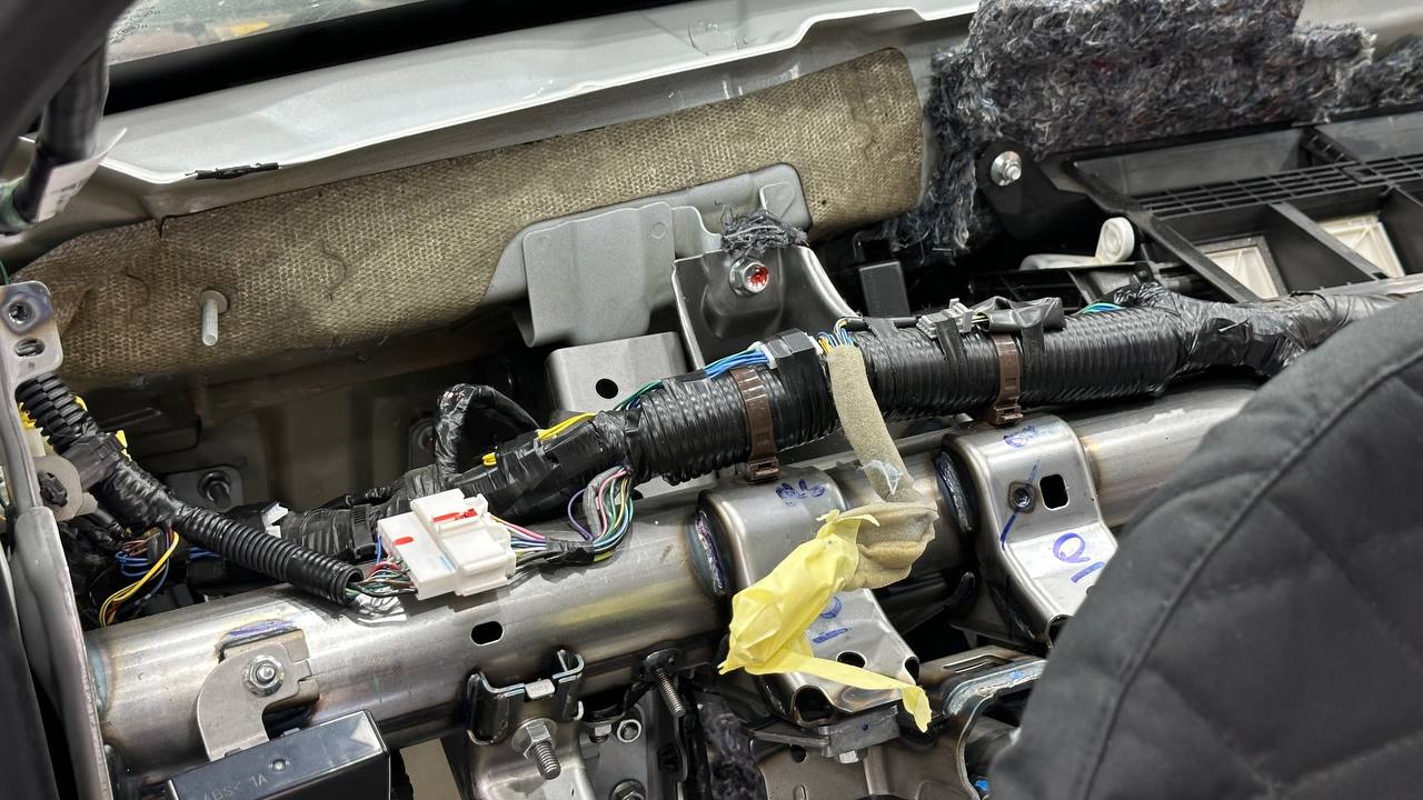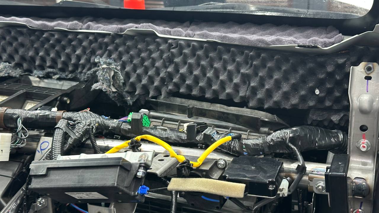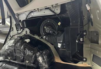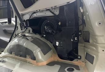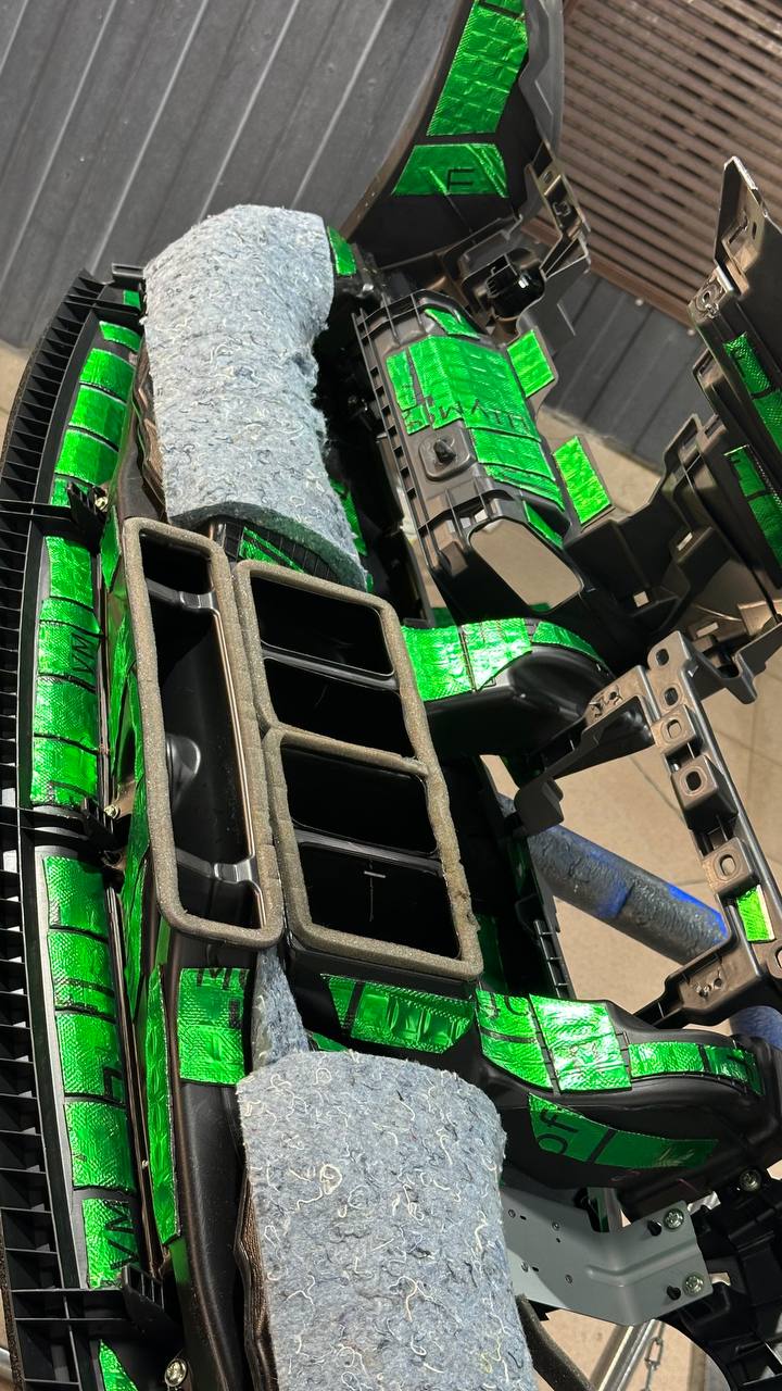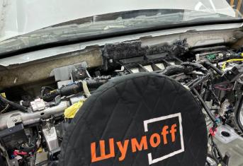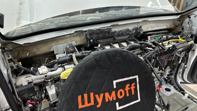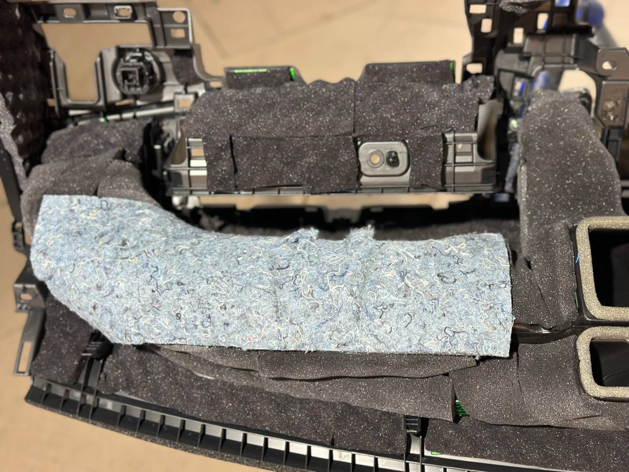 По нашей рекомендации, сделали дополнительную шумоизоляцию торпедо. Это существенно снижает звук работы мотора в салоне. После разборки монтируем виброизоляцию Шумофф М4 на моторный щит. Вторым слоем наносим топовый шумопоготитель Герметон А30.