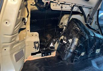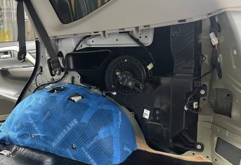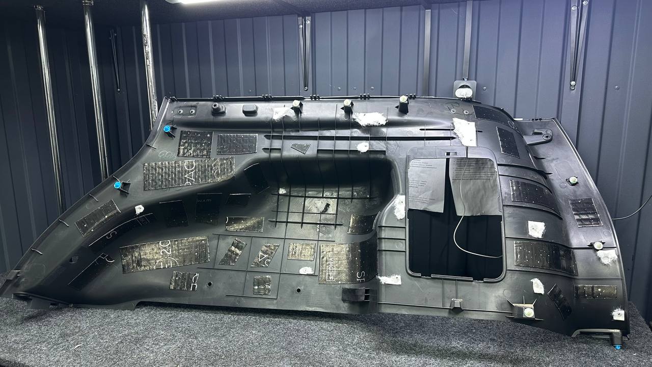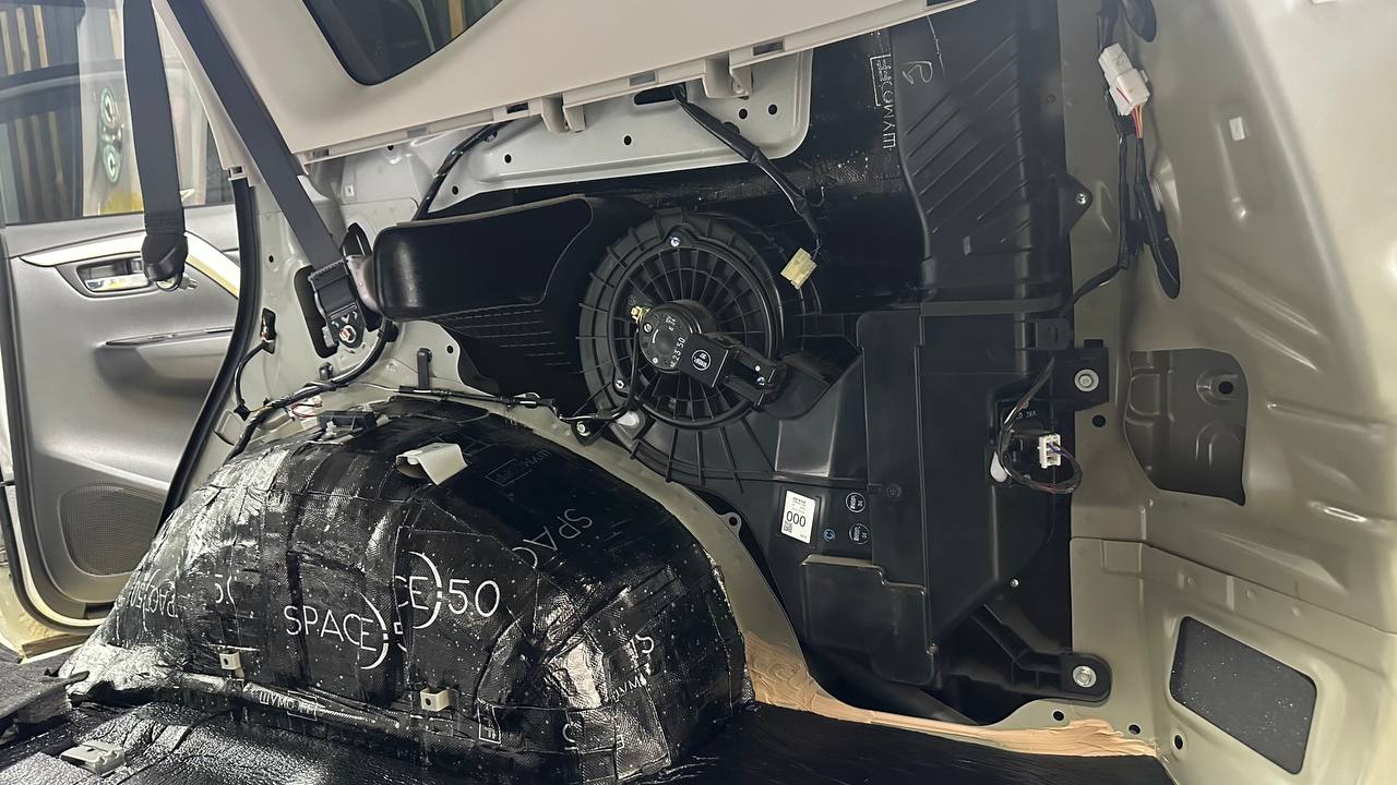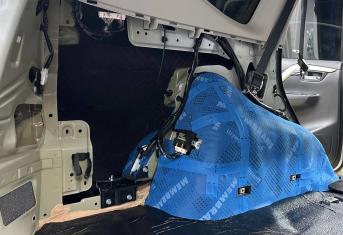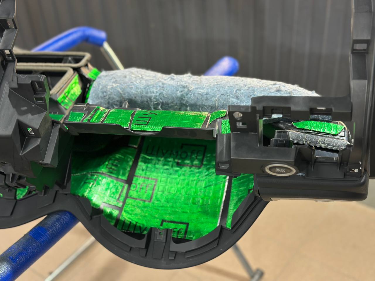 Технологические отверстия двери закрываем армирующим материалом Шумофф Bass для того чтобы сделать закрытый объем для динамика и максимально демпфировать вторую стенку двери. Третьим слоем применяем виброизоляцию Шумофф Space 2.0 на вторую стенку двери. Всю проводку на двери обрабатываем уплотнительным материалом Шумофф Specific. Саму обшивку двери оклеиваем локально виброизоляцией Шумофф Space 2.0 и полностью закрываем шумопоглощающим материалом Шумофф Герметон А15. По канту обшивки двери укладываем Шумофф Absorber 5, чтобы избежать раздражительных звуков и не портить лакокрасочное покрытие.