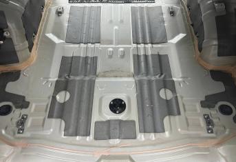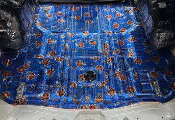 На первый слой по всему полу, от моторного щита до багажника используем Шумофф Space 5.0 – это премиальный многослойный вибродемпфер, включающий в себя прослойки мастики и битума. Эти составляющие позволяют ему эффективно работать в широком температурном диапазоне. Перед началом работ листы необходимо прогревать до 50 градусов, а затем приступать к прокатке валиком. В задние крылья укладываем виброизоляцию Шумофф Space 2.0 и прикатываем с помощью валика на длинной ручке. В нишу запасного колеса монтируем Шумофф Super Jack, это технологичный материал который позволяет добиться максимального результата и при этом не перегрузить пол в багажнике.