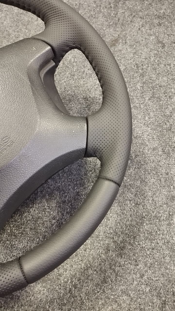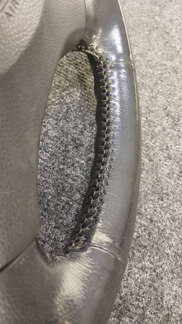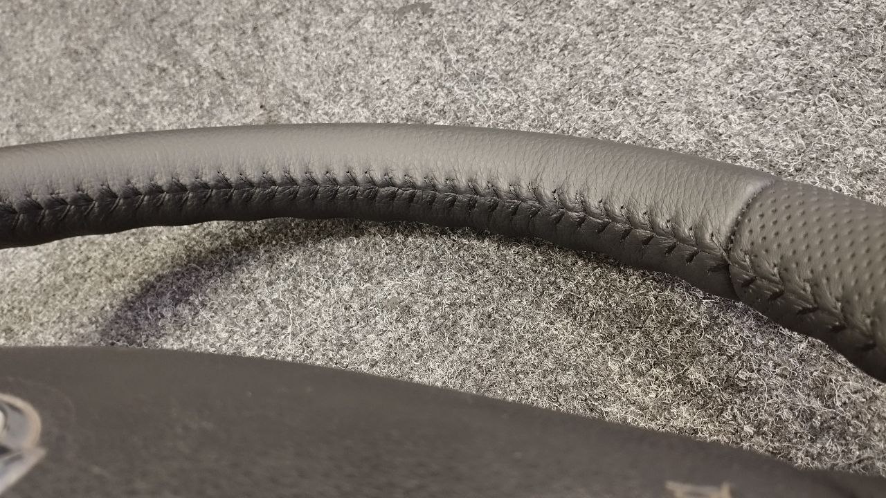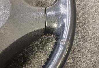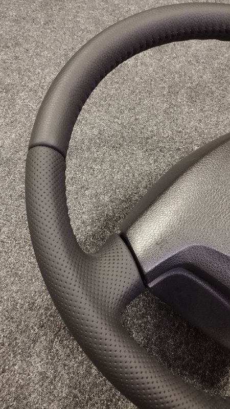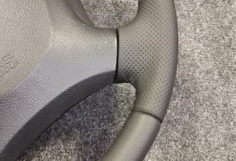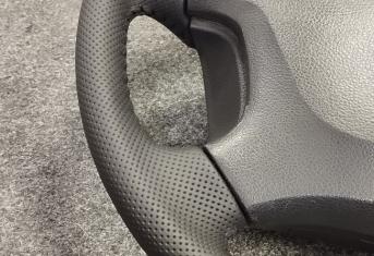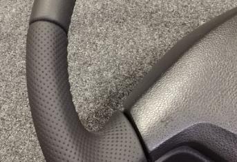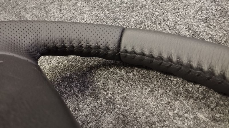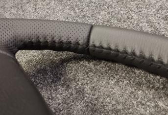За время эксплуатации авто кожа на руле сильно износилась, появился блеск и отслоение заводского материала. Клиент решил восстановить руль и ручку КПП. Задача была заменить материалы. При перетяжки руля и ручки КПП Nissan Patrol мы применили комбинацию текстурной кожы Российского производства и псевдоперфорации Итальянского производства. Клиент выбрал шов «елочка» черными нитками, точно как и в заводском исполнении.
