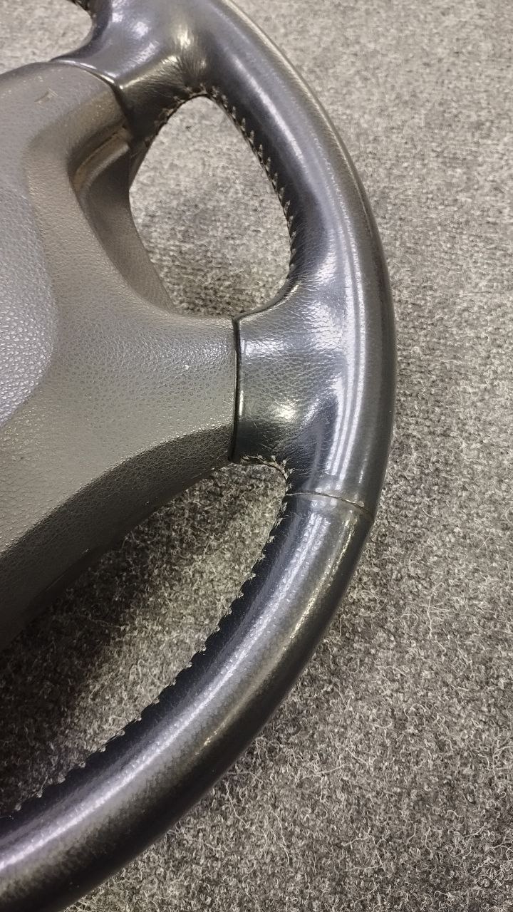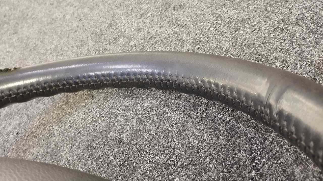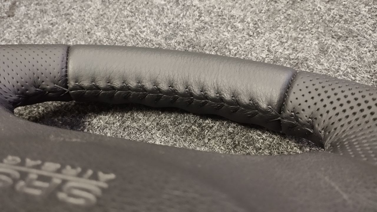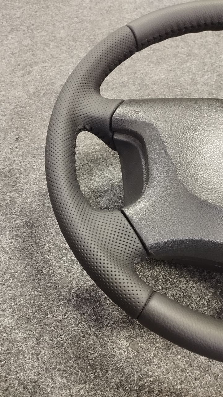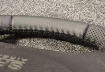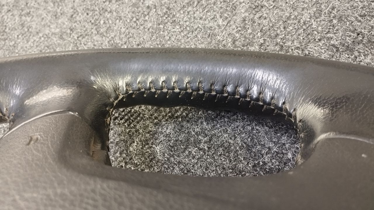 За время эксплуатации авто кожа на руле сильно износилась, появился блеск и отслоение заводского материала. Клиент решил восстановить руль и ручку КПП. Задача была заменить материалы. При перетяжки руля и ручки КПП Nissan Patrol мы применили комбинацию текстурной кожы Российского производства и псевдоперфорации Итальянского производства. Клиент выбрал шов «елочка» черными нитками, точно как и в заводском исполнении.