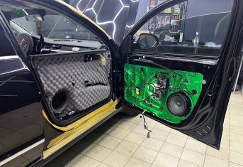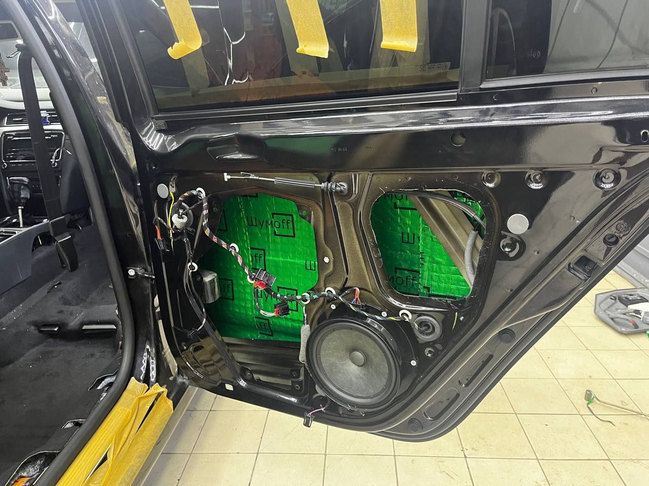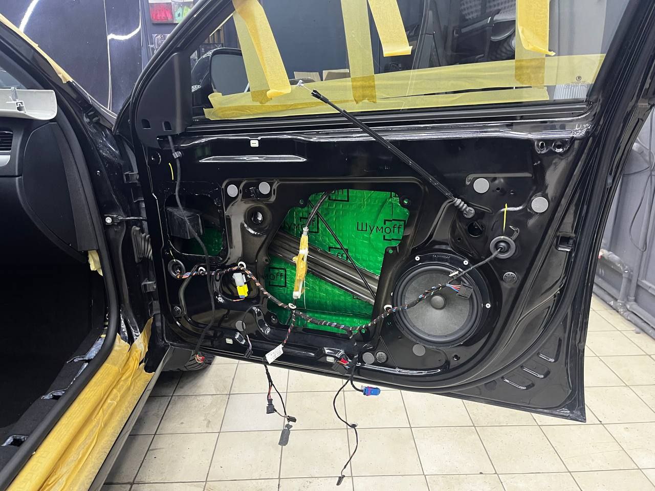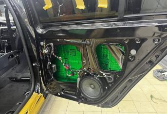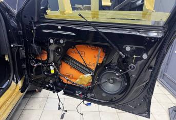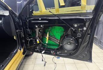 Вторую стенку двери обрабатываем Шумофф М2. Саму обшивку двери локально оклеиваем виброизоляцией Шумофф М2 для снижения резонанса пластика и полностью закрываем новым шумопоглощающим материалом от компании Шумофф, это Ultimat W17. По канту обшивки двери укладываем Шумофф Absorber 5, а на открытую проводку Шумофф Specific.