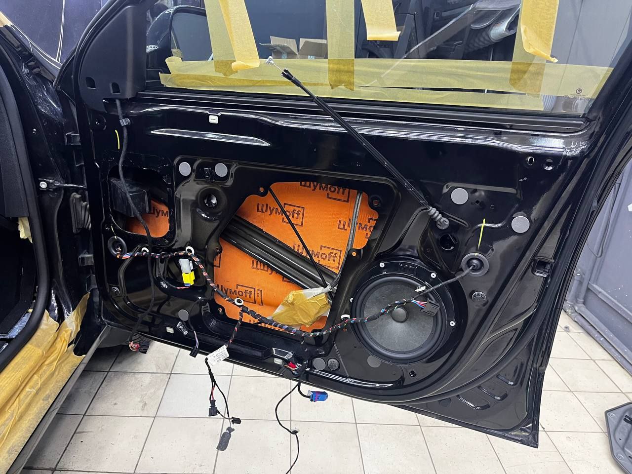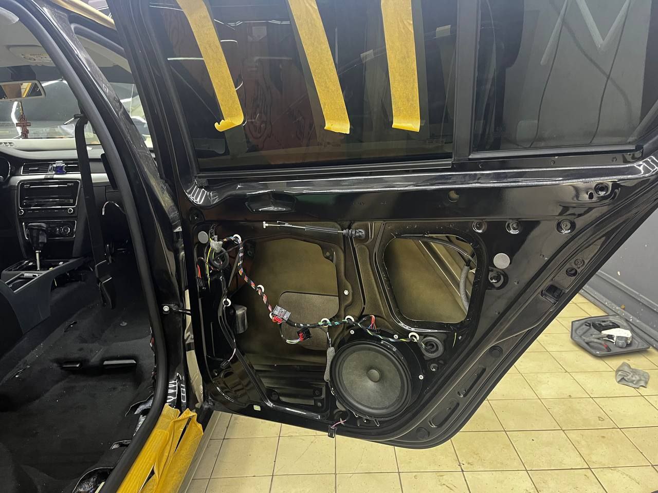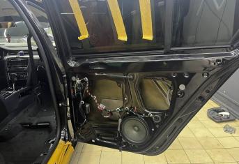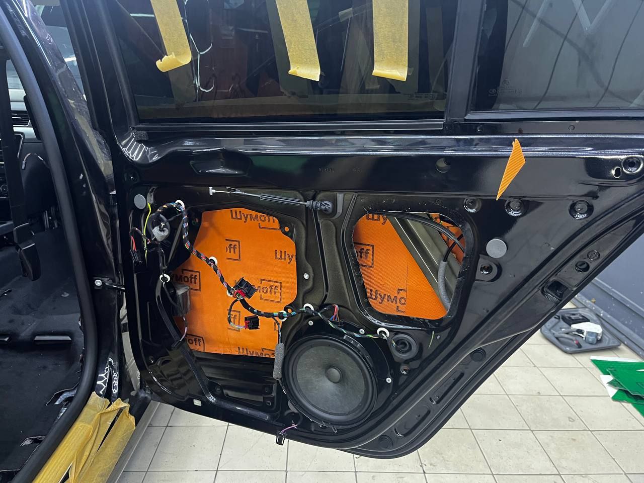 Вторую стенку двери обрабатываем Шумофф М2. Саму обшивку двери локально оклеиваем виброизоляцией Шумофф М2 для снижения резонанса пластика и полностью закрываем новым шумопоглощающим материалом от компании Шумофф, это Ultimat W17. По канту обшивки двери укладываем Шумофф Absorber 5, а на открытую проводку Шумофф Specific.