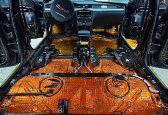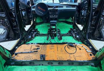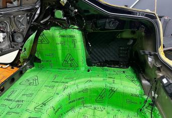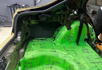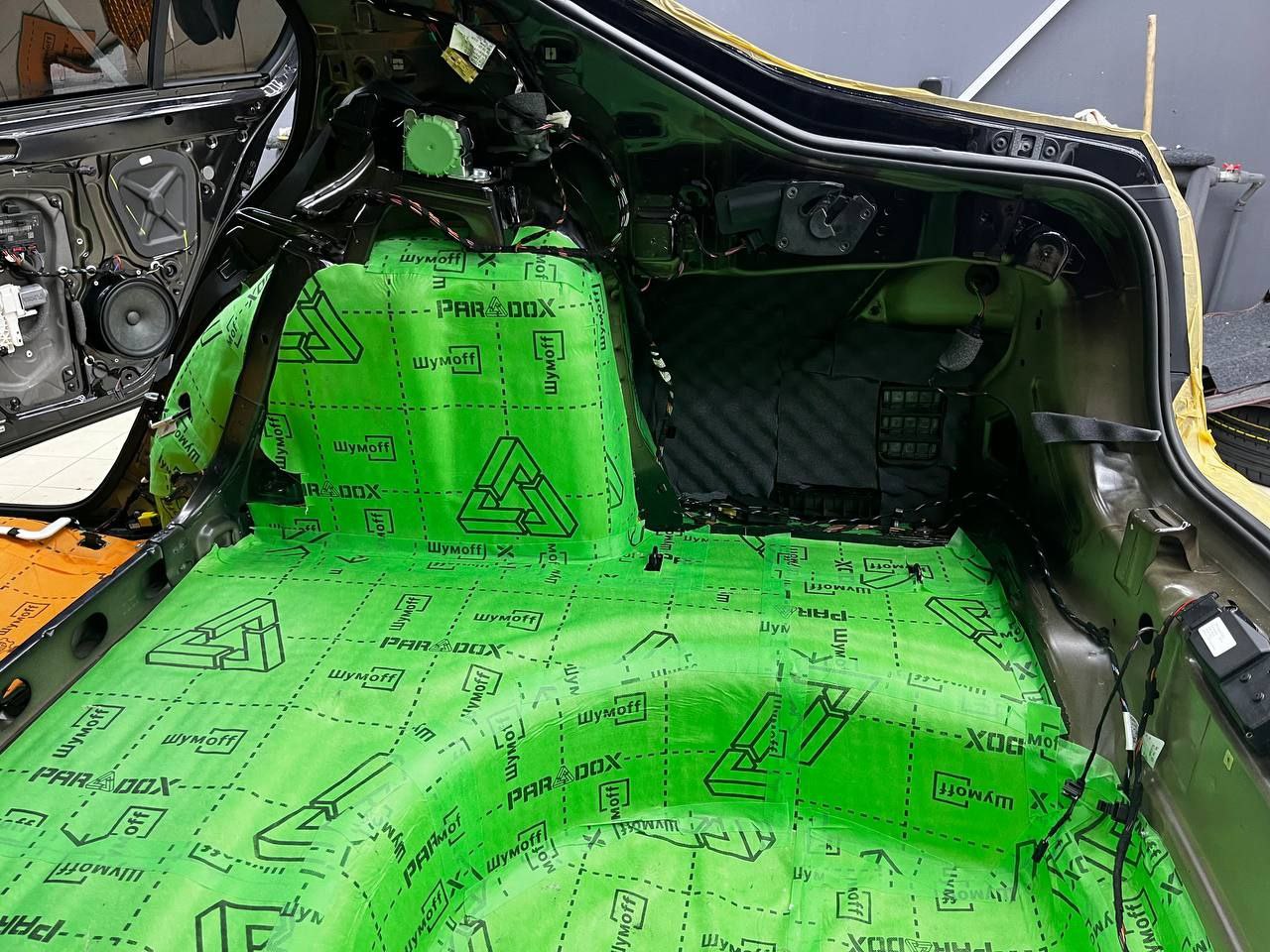 Вторым слоем для шумоизоляции пола мы используем Шумофф Парадокс для всей нижней части салона за исключением места под задним сидением, туда монтируем Шумофф Композит, чтобы избежать проблем со установкой заднего сидения. Это новые материалы от производителя Шумофф, которые включают в себя сразу два слоя и кратно повышают результативность. На задние крылья наносим шумопоглотитель Practick Flex A15.