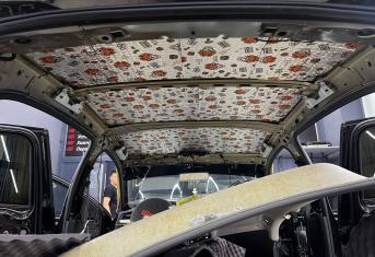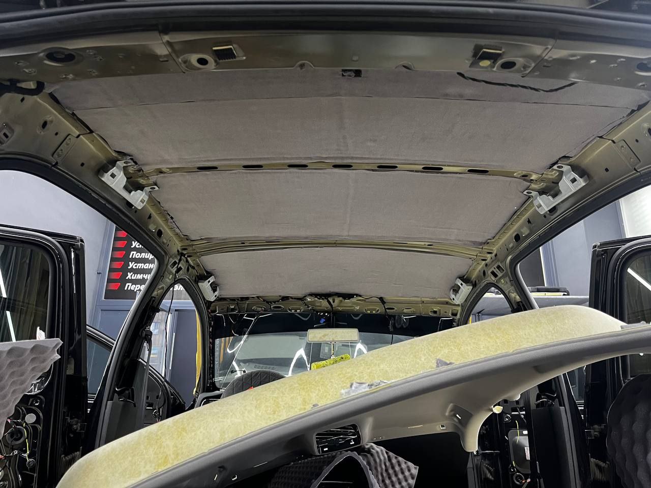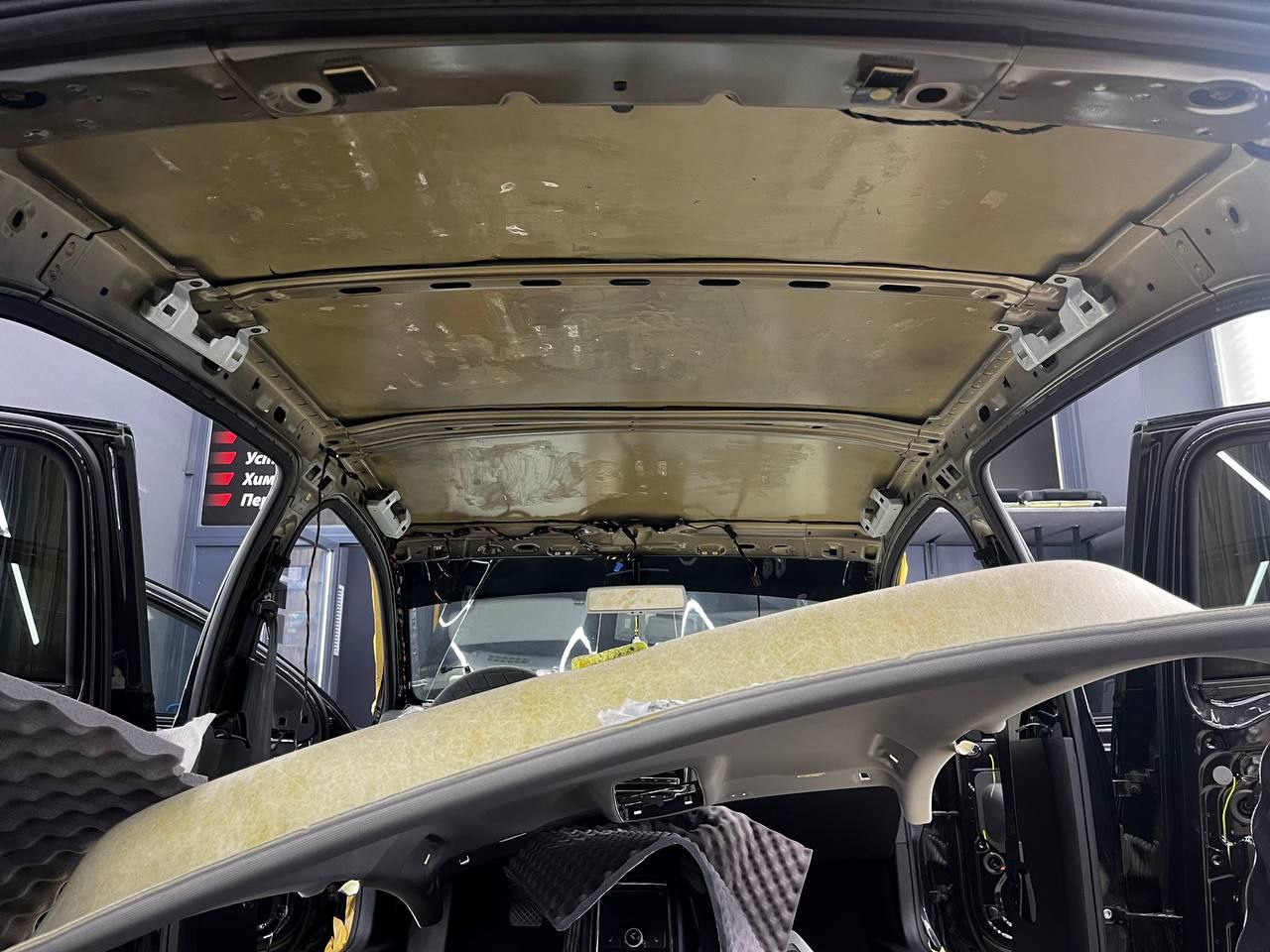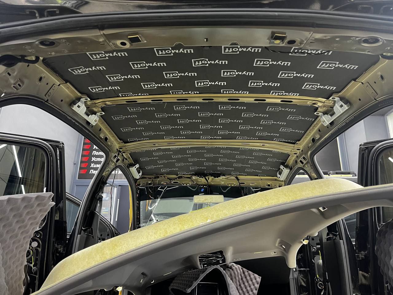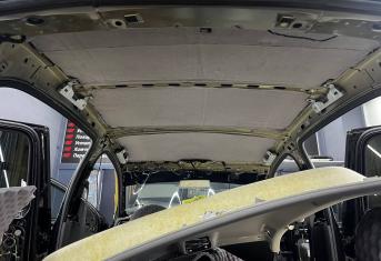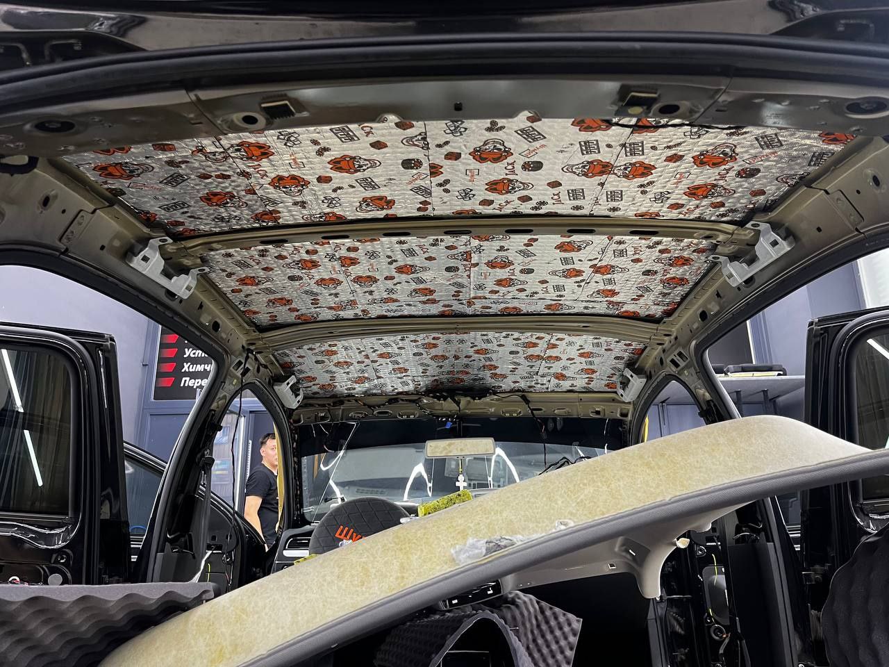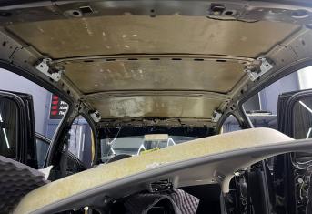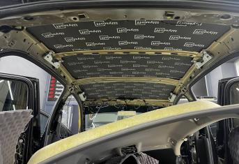 Первым слоем на крышу монтируем виброизоляцию Шумофф Jack. Второй слой шумо-теплоизоляция Шумофф Комфорт 3 для сохранения комфортной температуры внутри авто. Зимой все тепло уходит вверх, а если нет теплоизоляционной прослойки, оно не задерживается в салоне, так же как и летом стоя в пробке, солнце нагревает крышу автомобиля и тепло идет в салон. Именно по этой причине, мы обязательно во всех наших пакетах монтируем теплоизоляционную прослойку на крышу автомобиля. Сверху всё покрывается новым шумопоглотителем от компании Шумофф, это Velvet 7. Все материалы плотно прикатываются валиком по ровным плоскостям, исключая усилители и попадание воздуха.