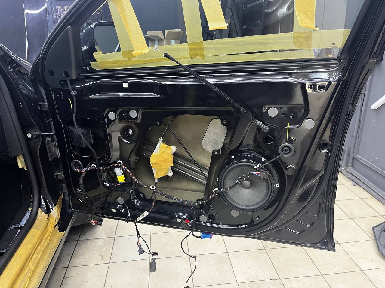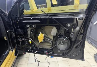 Начинаем работу с разборки дверей, подготовки поверхности и обезжириванию. Все работы по демонтажу пластика выполняются специальным инструментом. Мы гарантируем целостность клипс, креплений и отсутствие различного рода царапин, задиров на обшивках.