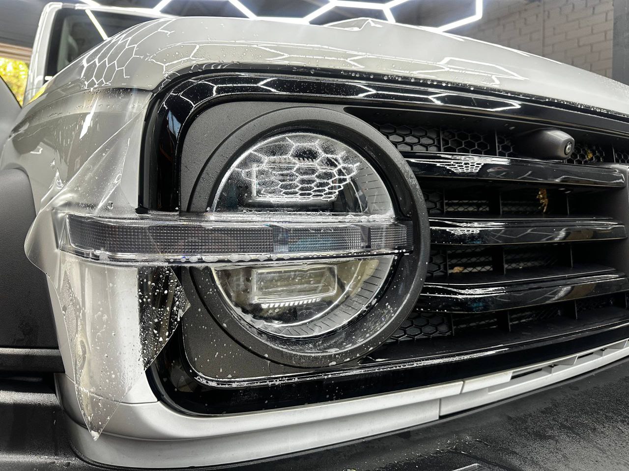 - Арматурные работы – снимаем решетку, бампер из-за его сложной формы. Это необходимо чтобы сделать максимально качественные подвороты пленки.