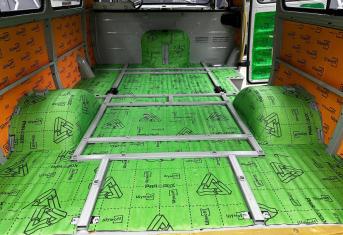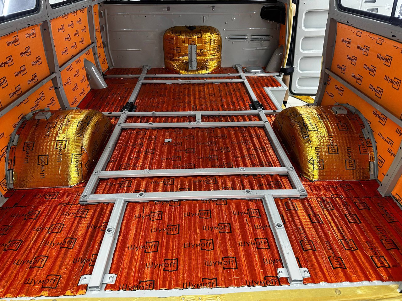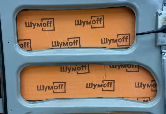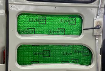 Первым слоем укладывается виброизоляция Шумофф М4, М3 и М2. Шумофф М4 пойдет на кабину и задние арки, М3 на пол в кузове. Боковые стенки обрабатываем Шумофф М2. Поверх усилителей она не наносится, чтобы избежать парникового эффекта и появлению влаги под ковром.