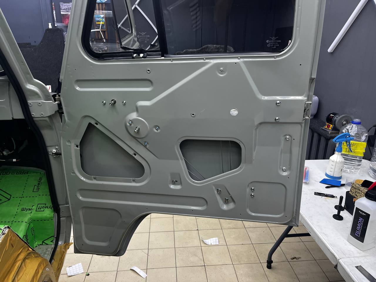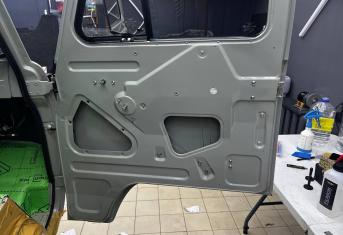 Начинаем работу с разборки дверей, подготовки поверхности и обезжириванию. Все работы по демонтажу пластика выполняются специальным инструментом. Мы гарантируем целостность клипс, креплений и отсутствие различного рода царапин, задиров на обшивках.