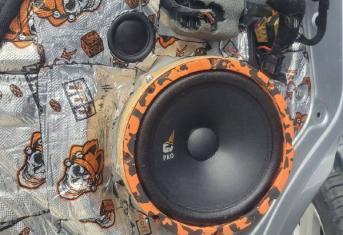 В передних дверях у нас расположились двадцатые широкополосные динамики, а в задние боковины 16 широкополосники. Силовая проводка уложена по штатным местам, с обязательной установкой предохранителя под капотом. Управляет системой по прежнему штатное головное устройство, добиться этого получилось с помощью установки конвектора уровня, который как и усилитель мы расположили под передним правым сидением. Тем самым сохранили полезное пространство в багажнике.