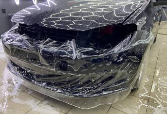 - Арматурные работы – снимаем решетку, бампер из-за его сложной формы. Это необходимо чтобы сделать максимально качественные подвороты пленки.