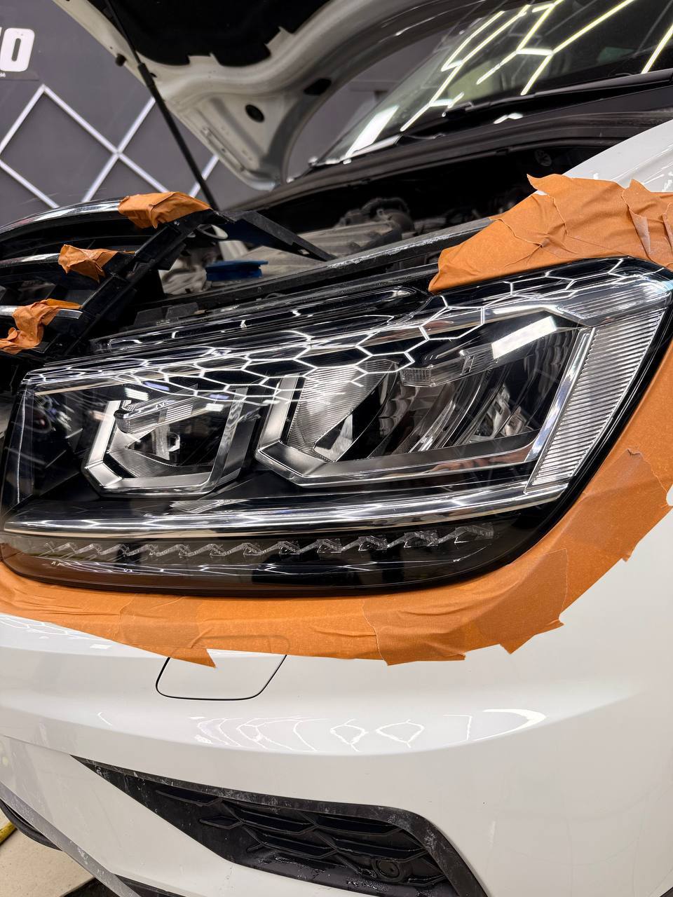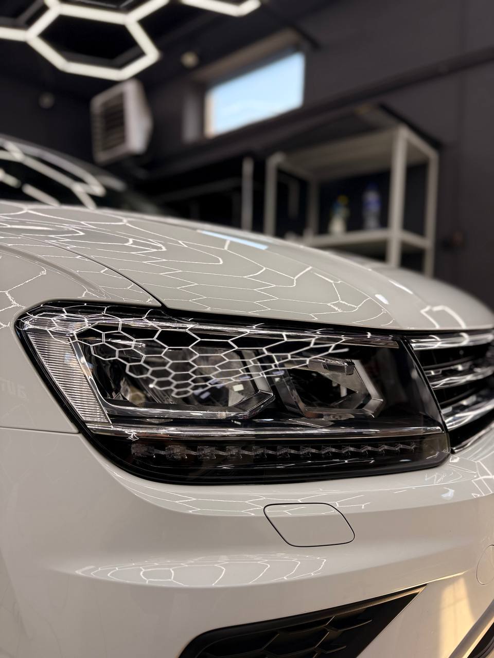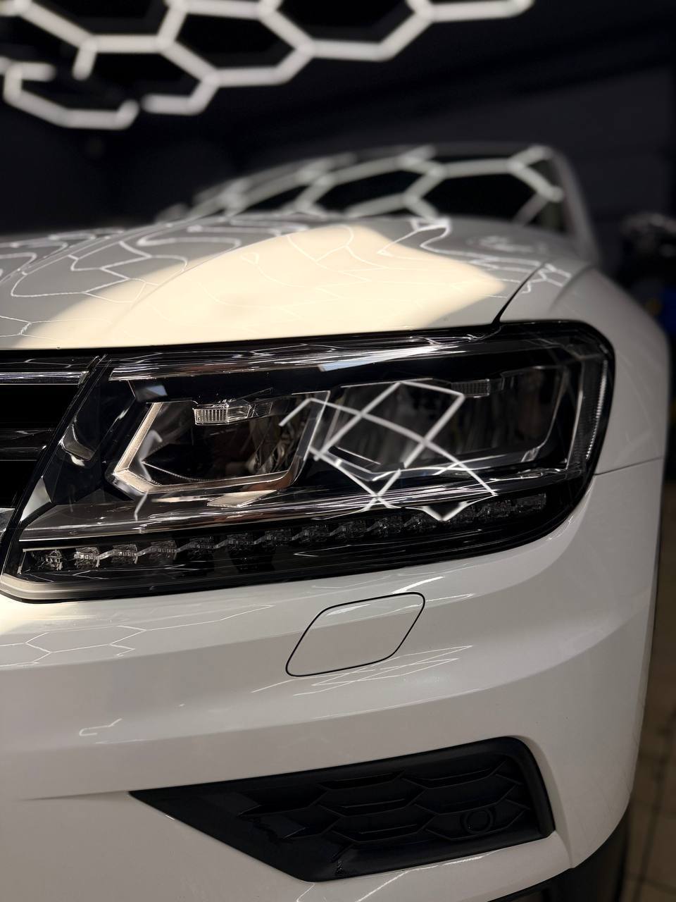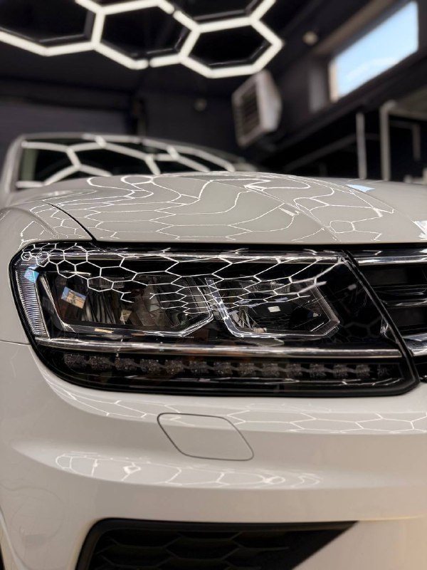Мы потратили 4 часа на обслуживание Volkswagen Tiguan, что включало полировку и оклейку защитной пленкой. Важно подчеркнуть, что все процедуры были выполнены без демонтажа фар.