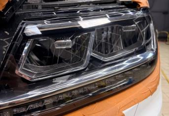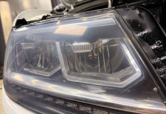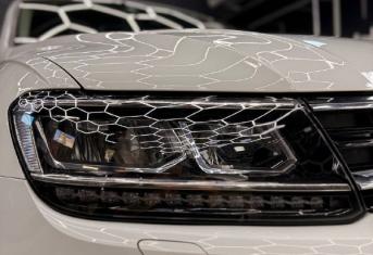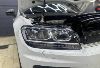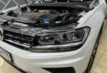 При увеличении пробега автомобиля наблюдается потеря прозрачности стекол, что влечёт за собой уменьшение светопропускания и может стать риском для безопасности на дороге. Volkswagen Tiguan был доставлен для выполнения работ по восстановлению прозрачности фар и их последующей защиты полиуретановой пленкой.